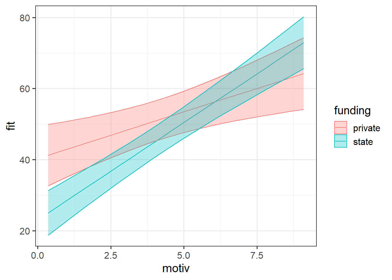 ggplot(aes(x=motiv,y=fit,col=funding,fill=funding))+