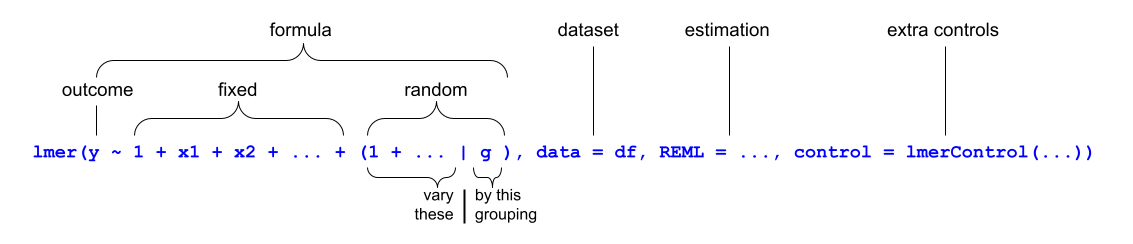 Additionally, as you become more practiced at fitting multilevel models, you may well begin to think of these models in terms of the lmer() syntax in R, rather than in terms of the mathematical expressions.