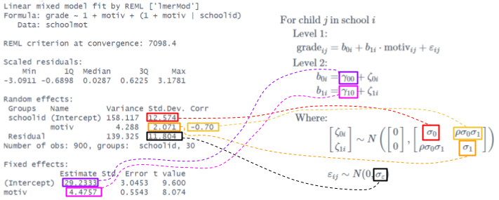 \[ \begin{align} \text{For Child }j\text{ in School }i& \\ \text{Level 1 (child):}& \\ \text{grade}_{ij} &= b_{0i} + b_1 \cdot \text{motiv}_{ij} + \epsilon_{ij} \\ \text{Level 2 (school):}& \\ b_{0i} &= \gamma_{00} + \zeta_{0i} \\ \text{where: }& \\ &\zeta_{0i} \sim N(0,\sigma_0) \\ &\varepsilon_{ij} \sim N(0,\sigma_\varepsilon) \\ \end{align} \]
