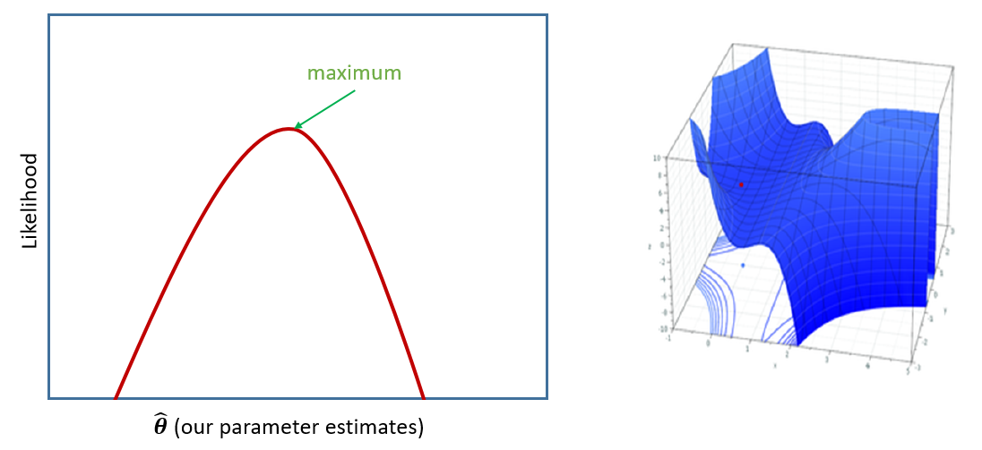 If we were estimating just one single parameter (e.g. a mean), then we can imagine the process of maximum likelihood estimation in a one-dimensional world - simply finding the top of the curve (Figure 13, LH panel).