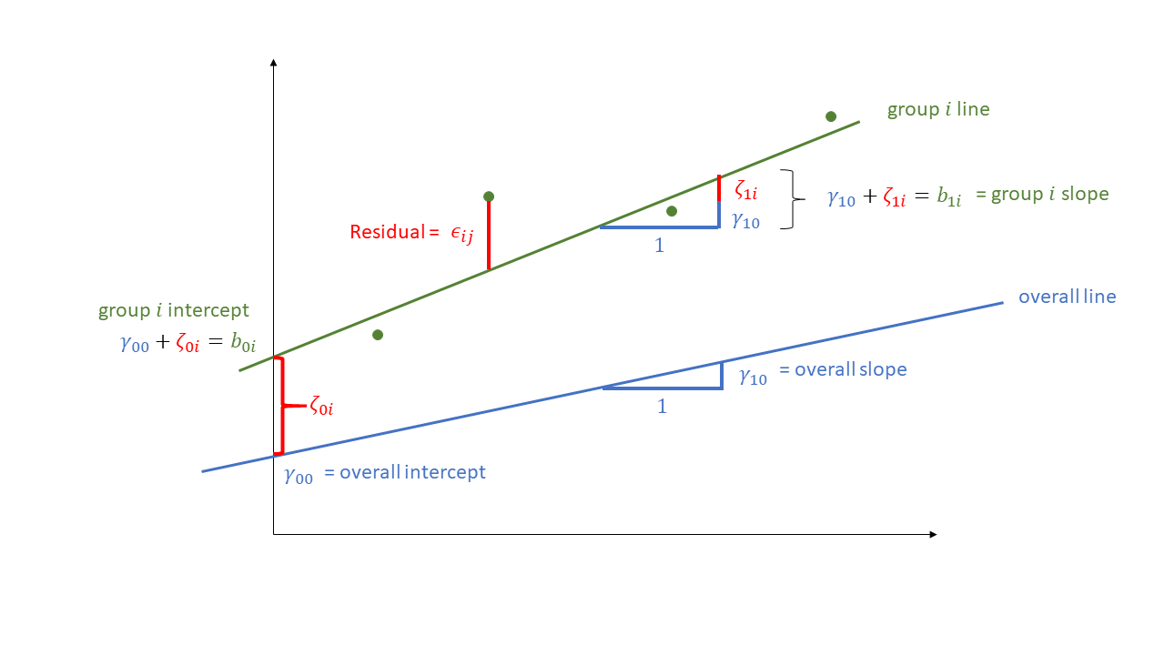 \[ y_{ij} = \underbrace{(\underbrace{\gamma_{00}}_{\textrm{fixed}} + \underbrace{\zeta_{0i}}_{\textrm{random}})}_{\text{intercept, }b_{0i}} \cdot 1 + \underbrace{b_1}_{\textrm{fixed}} \cdot x_{ij} + \varepsilon_{ij} \]