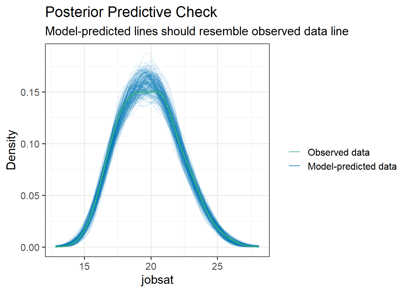 Sometimes, a good global assessment of your model comes from how good a representation of the observed data it is. We can look at this in a cool way by simulating from our model a new set of values for the outcome. If we do this a few times over, and plot each ‘draw’ (i.e. set of simulated values), we can look at how well it maps to the observed set of values: