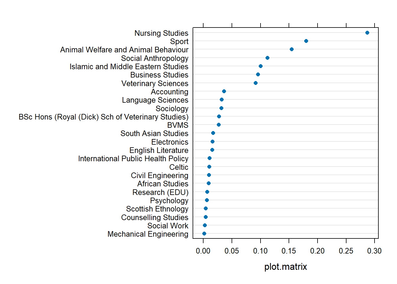 For instance, to refit our model without employees of the ‘Nursing Studies’ department: