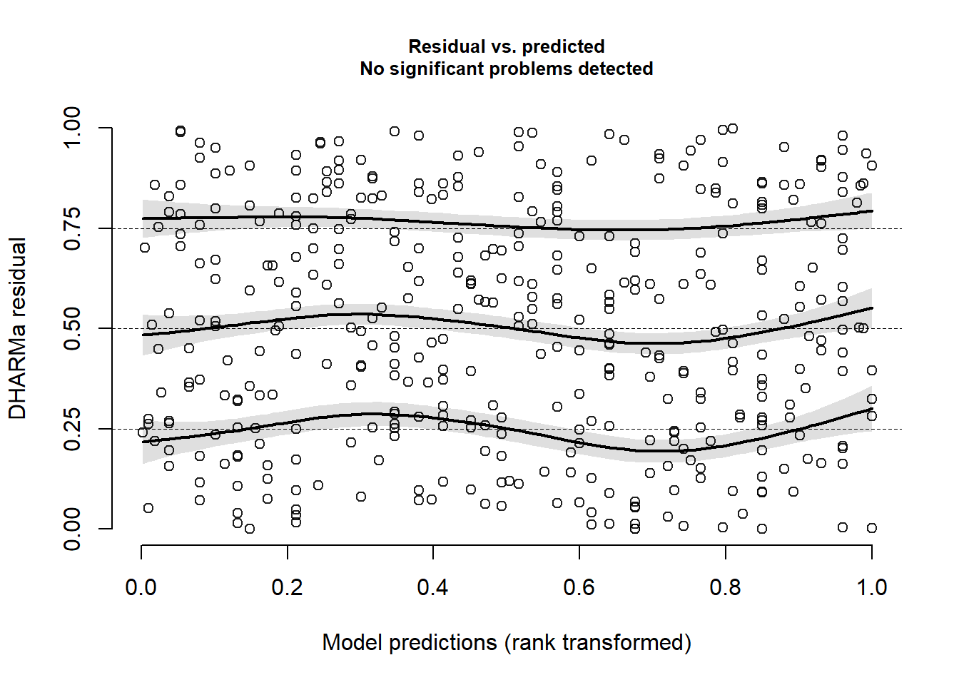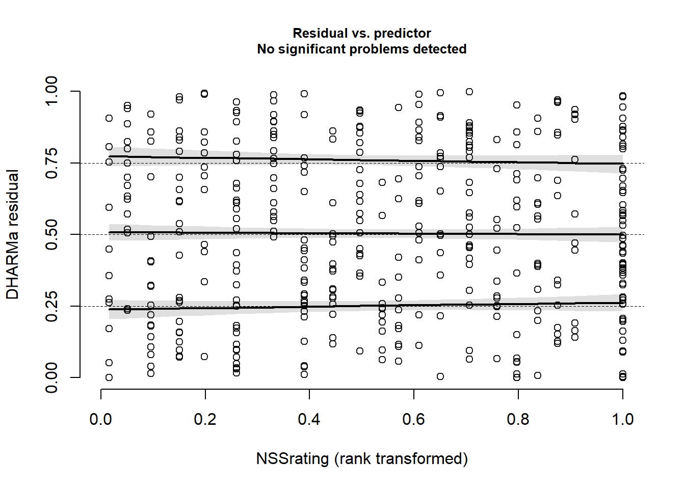 msim <- simulateResiduals(fittedModel = jsmod2)If our model is correctly specified, then the DHARMa residuals we would expect to be uniform (i.e. flat), and also uniform distributed across any predictor.