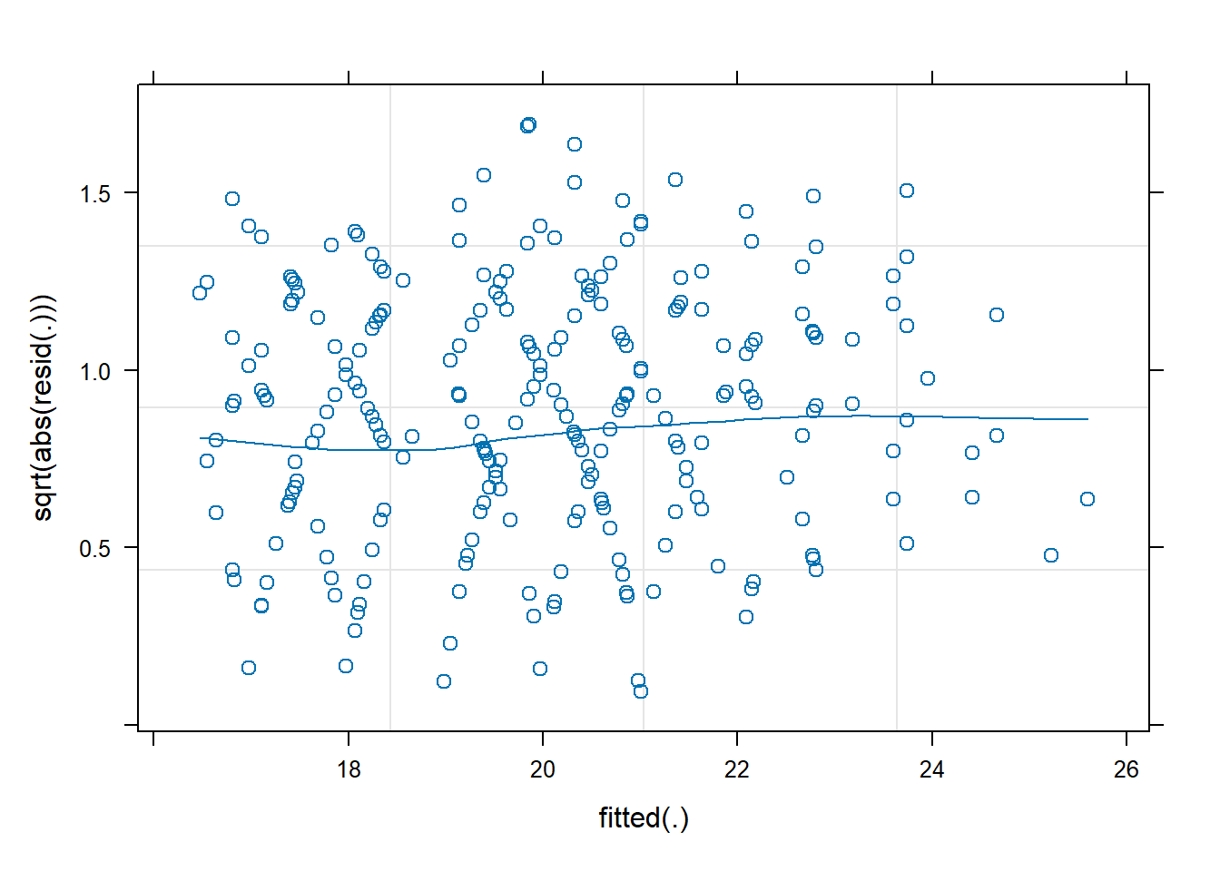 form = sqrt(abs(resid(.))) ~ fitted(.),