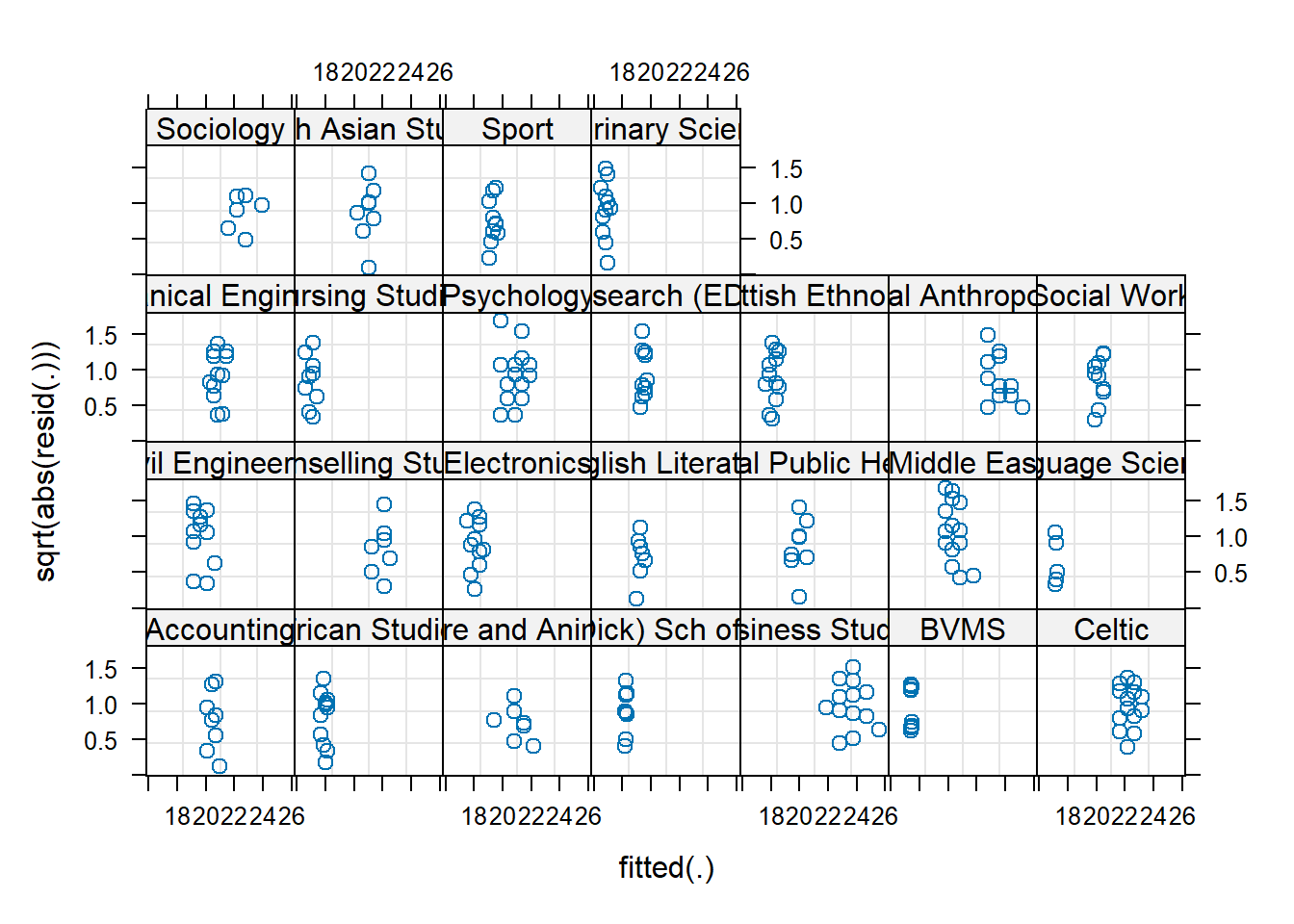 form = sqrt(abs(resid(.))) ~ fitted(.) | dept,
