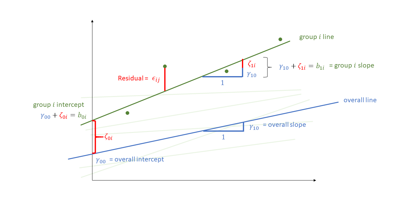 Not much is different in the multilevel model - we simply now have “residuals” on multiple levels. We are assuming that our group-level differences represent one level of randomness, and that our observations represent another level. We can see these two levels in Figure 1, with the group-level deviations from the fixed effects (\(\color{orange}{\zeta_{0i}}\) and \(\color{orange}{\zeta_{1i}}\)) along with the observation-level deviations from that groups line (\(\varepsilon_{ij}\)).