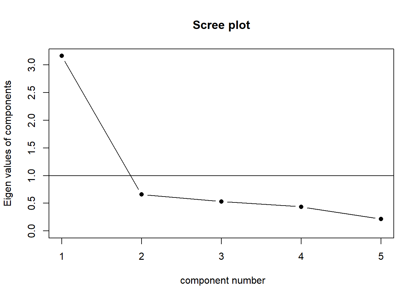 The scree plot is a graphical criterion which involves plotting the variance for each principal component. This can be easily done by calling plot on the variances, which are stored in $values of the object created by principal(), or by using the scree() function from the psych package.