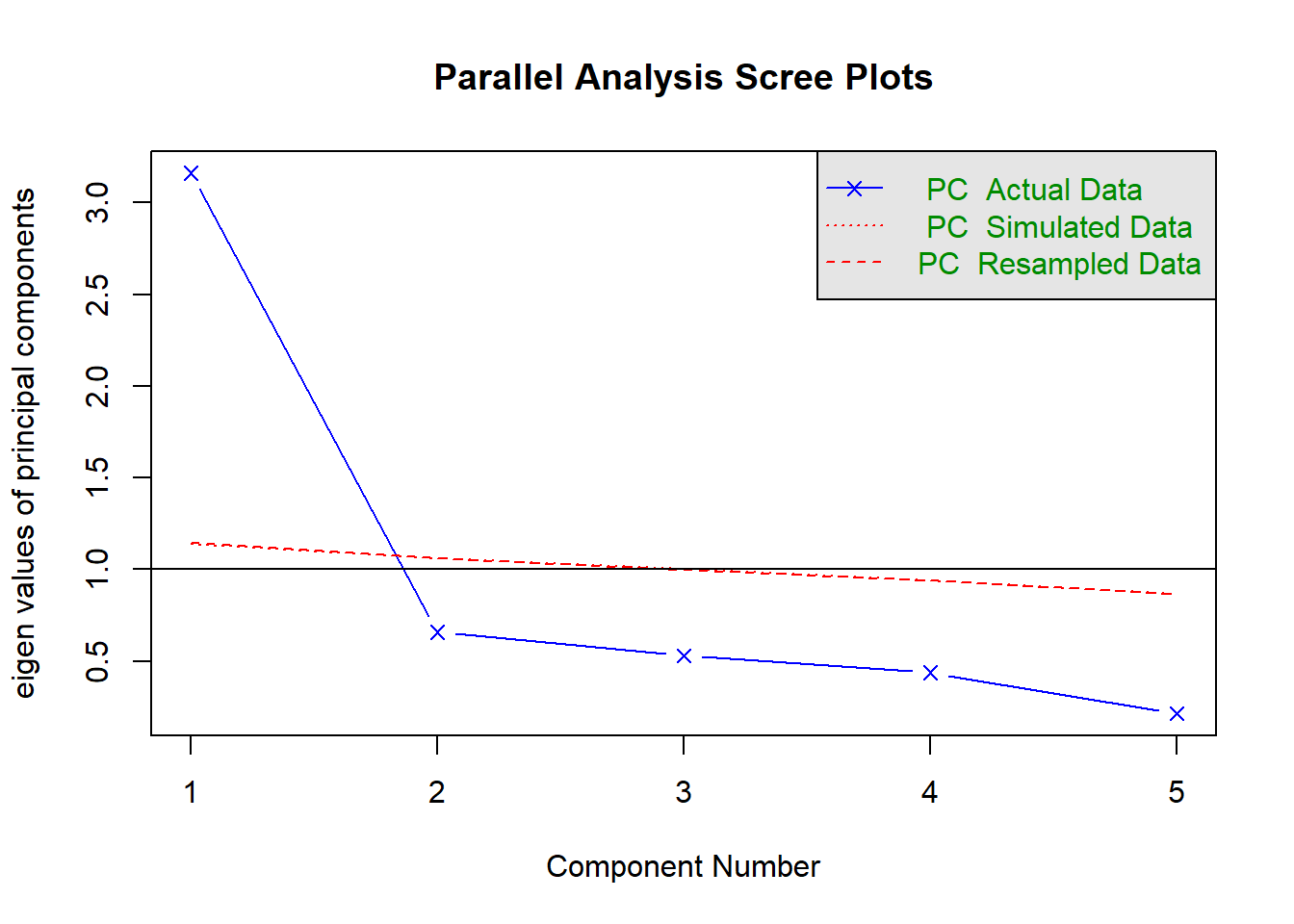 Parallel analysis involves simulating lots of datasets of the same dimension but in which the variables are uncorrelated. For each of these simulations, a PCA is conducted on its correlation matrix, and the eigenvalues are extracted. We can then compare our eigenvalues from the PCA on our actual data to the average eigenvalues across these simulations. In theory, for uncorrelated variables, no components should explain more variance than any others, and eigenvalues should be equal to 1. In reality, variables are rarely truly uncorrelated, and so there will be slight variation in the magnitude of eigenvalues simply due to chance. The parallel analysis method suggests keeping those components for which the eigenvalues are greater than those from the simulations.