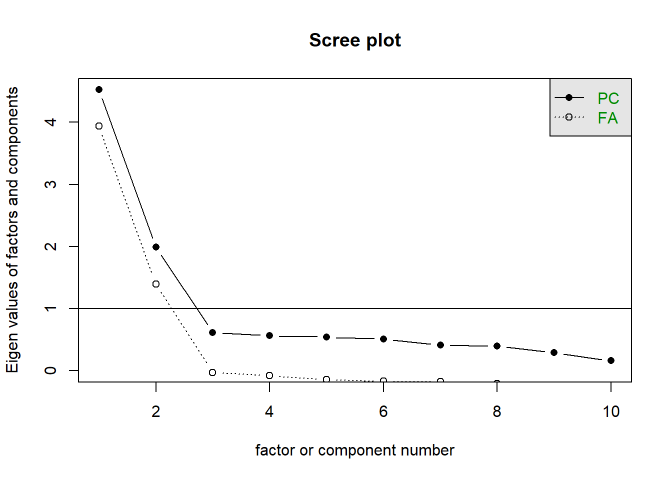 According to the scree plot criterion, we should keep as many principal components up to where the “elbow” in the plot occurs. So in the above plot, the elbow occurs at 2, so we would keep 1.