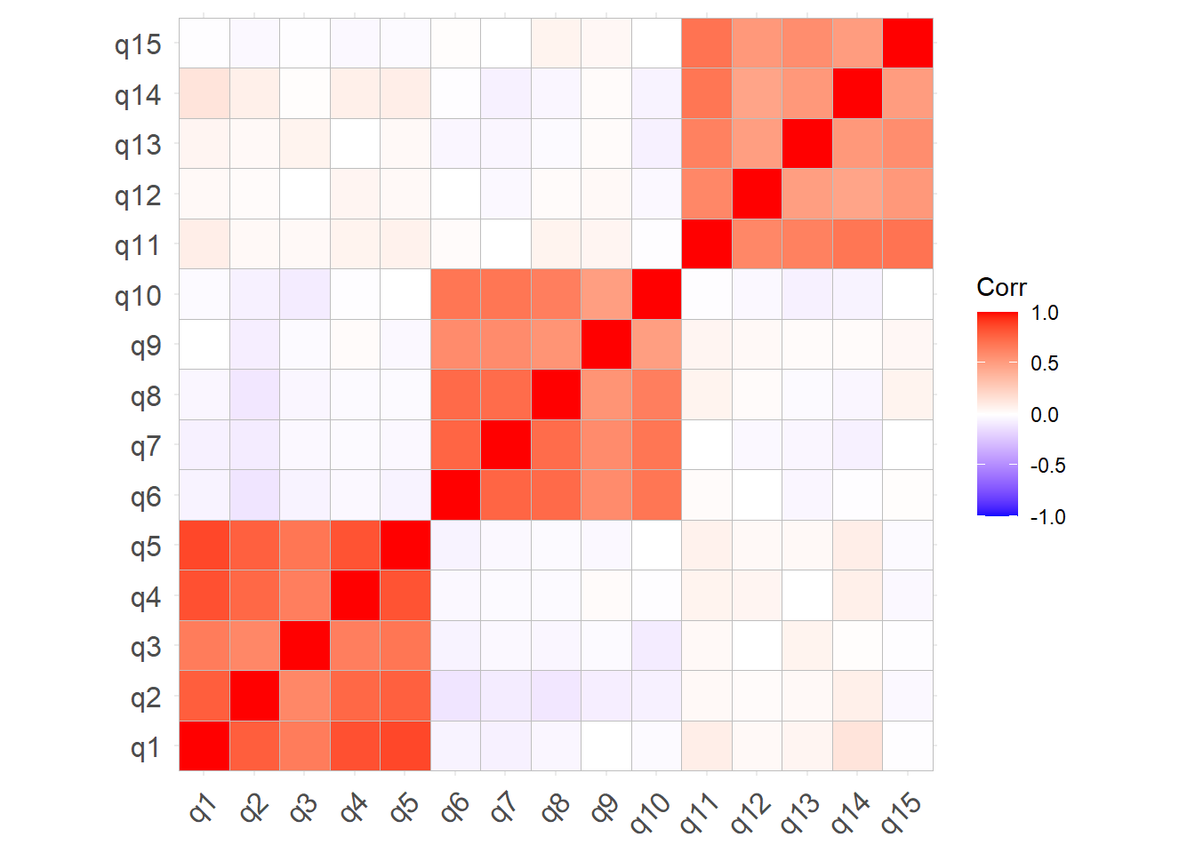 You’re probably going to want to subset out just the relevant variables (q1 to q15).