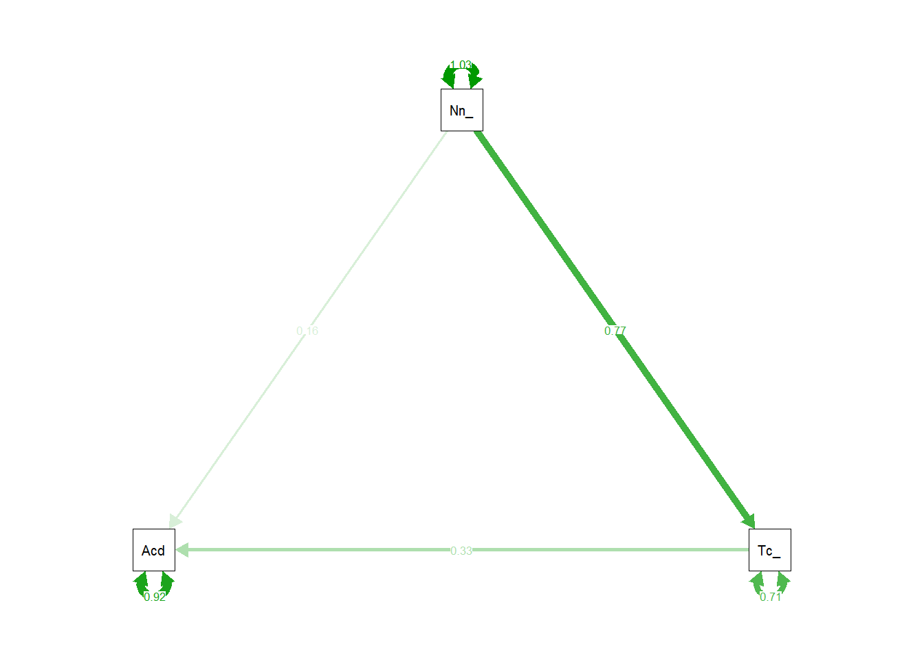 And the estimated path coefficients of \(a = 0.46\), \(b = 0.52\) and \(c = 0.19\), imply that our covariances are: