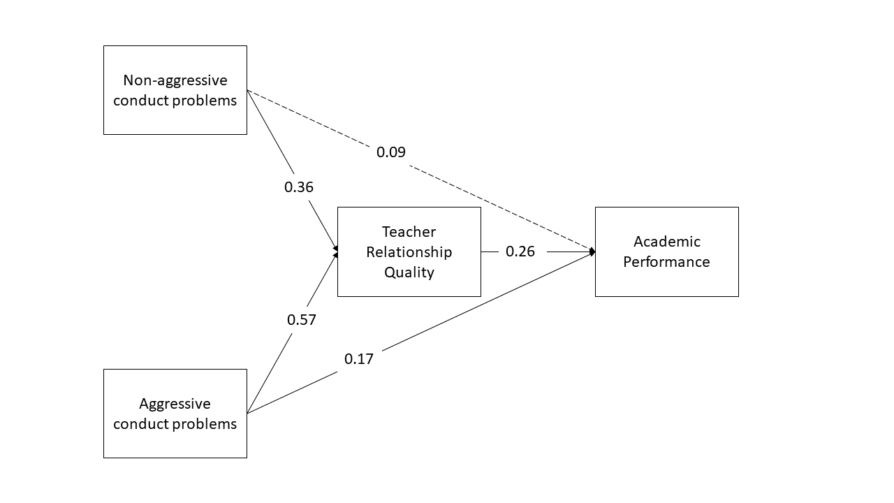 Make sure to define the indirect effect in order to test the hypothesis that non-aggressive conduct problems have both a direct and an indirect effect (via teacher relationships) on academic performance. Specify also the total (direct+indirect) effect of non-aggressive conduct problems on academic performance