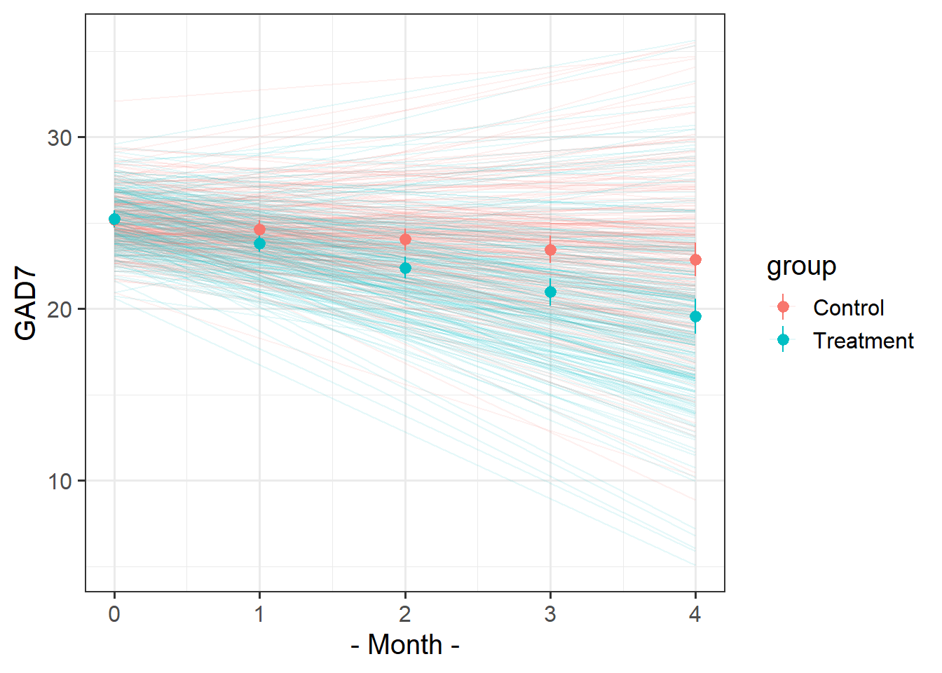 Fit a model to test if the psychoeducational treatment is associated with greater improvement in anxiety over time.
