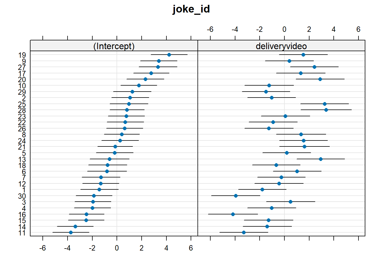 Think careful about this question. The random effects show us that jokes vary in their intercepts (ratings in audio-only) and in their effects of delivery (the random slopes). We want to know if these are related..