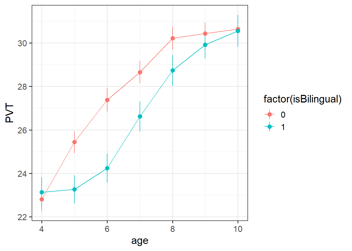 Previous research conducted on monolingual children has suggested that that scores on the PVT increase steadily up until the age of approximately 7 or 8 at which point they begin to plateau. The aim of the present study is to investigate differences in the development of vocabulary between monolingual and bilingual children.