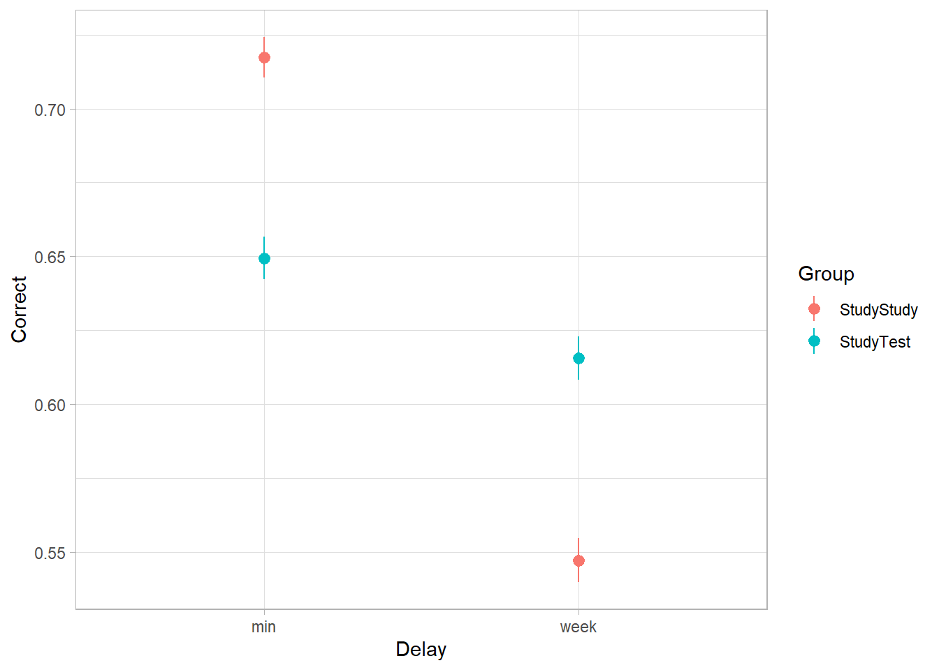 StudyStudygroup recall more items on the immediate test, but theStudyTestgroup will retain the material better and thus perform better on the 1-week follow-up test.