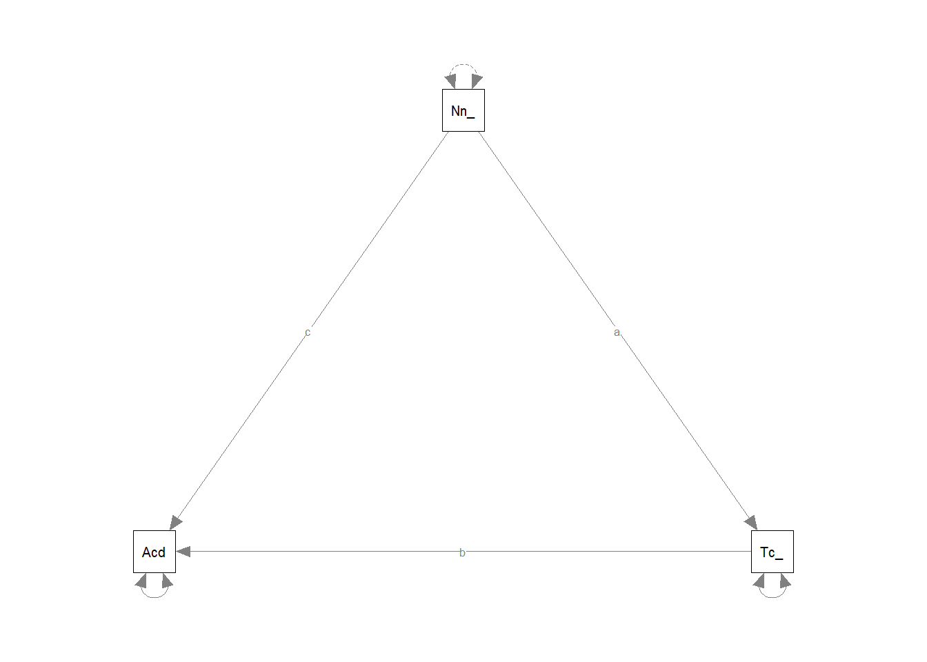 The variances of individual variables (also covariances of each variable with itself) are also in our covariance matrix on the diagonals, and in full, our model also includes the estimation of variances of exogenous variables, as well as the residual variance of endogenous variables. These can be represented as the paths \(d\), \(e\) and \(f\) in Figure 2.