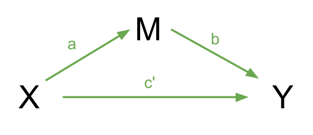 However, the effect of \(X\) on \(Y\) could in part be explained by the process of being mediated by some variable \(M\) as well as affecting \(Y\) directly. A path diagram representing this theoretical idea of ‘mediation’ is shown in Figure 9. In this case, path \(c'\) is the direct effect, and paths \(a\) and \(b\) make up the indirect effect.