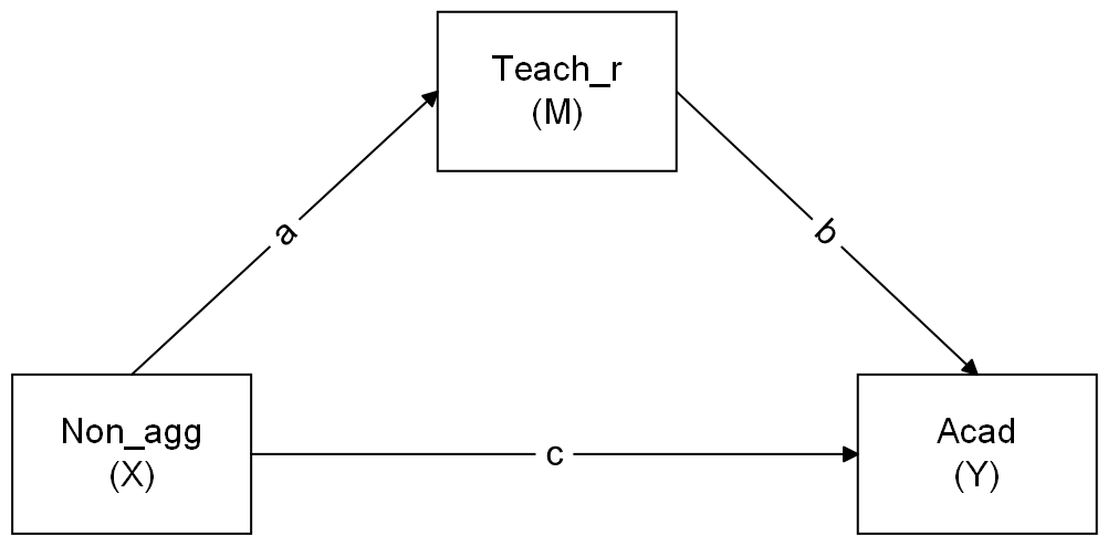 Make sure to define the indirect effect in order to test the hypothesis that non-aggressive conduct problems have both a direct and an indirect effect (via teacher relationships) on academic performance. Specify also the total (direct+indirect) effect of non-aggressive conduct problems on academic performance