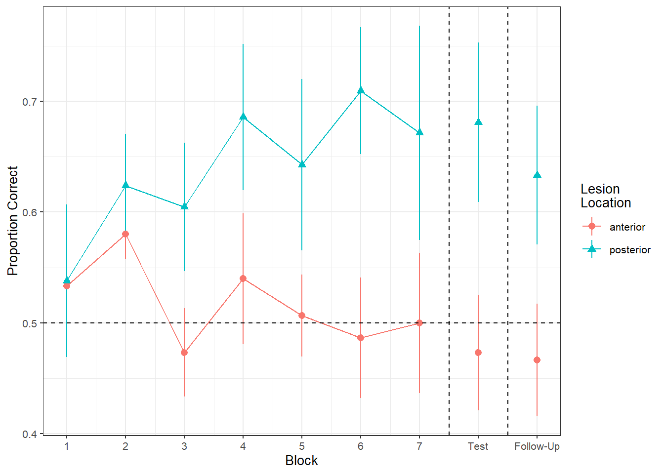 Figure 1 shows the differences between lesion location groups in the average proportion of correct responses at each point in time (i.e., each block, test, and follow-up)