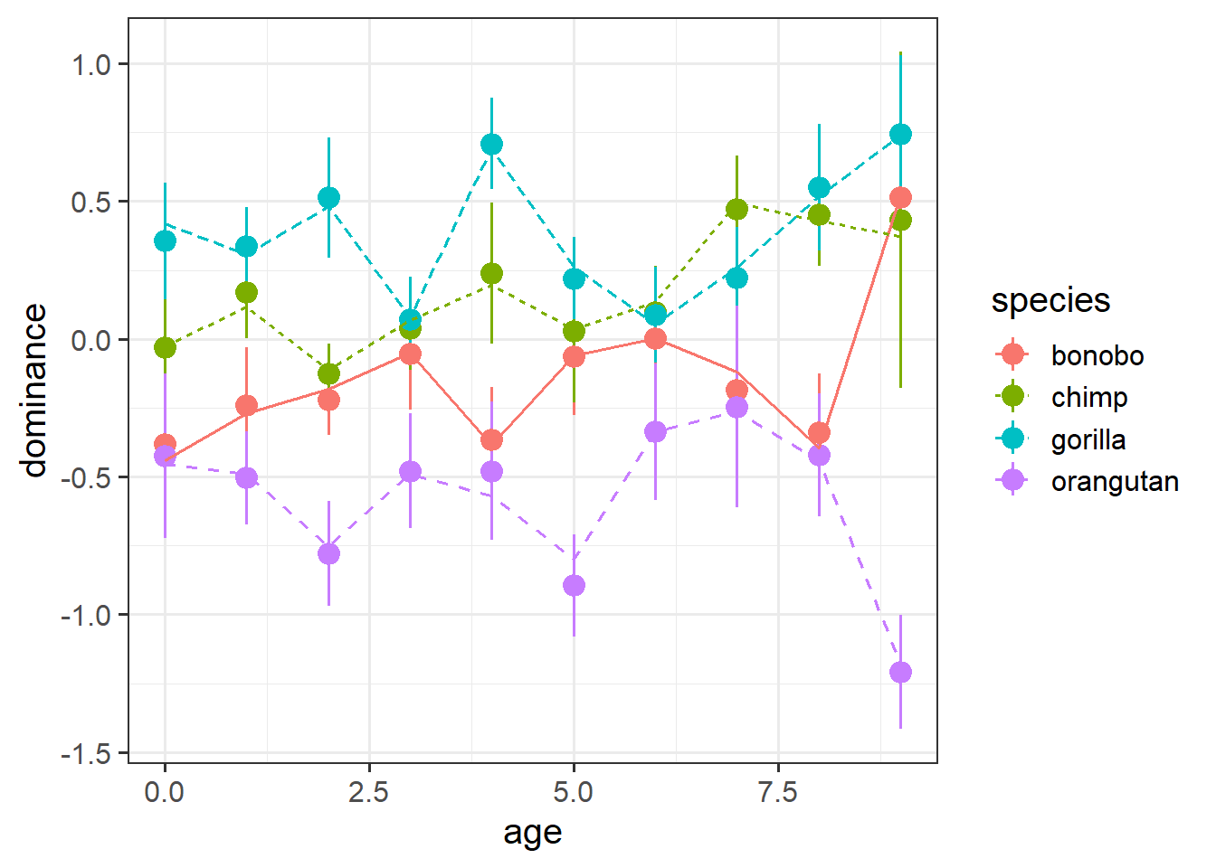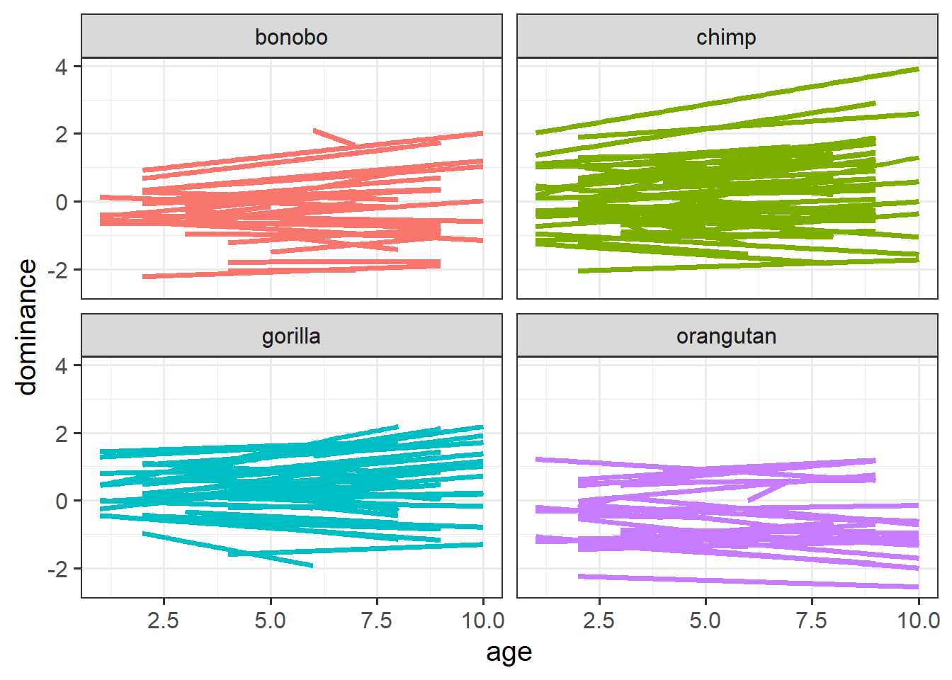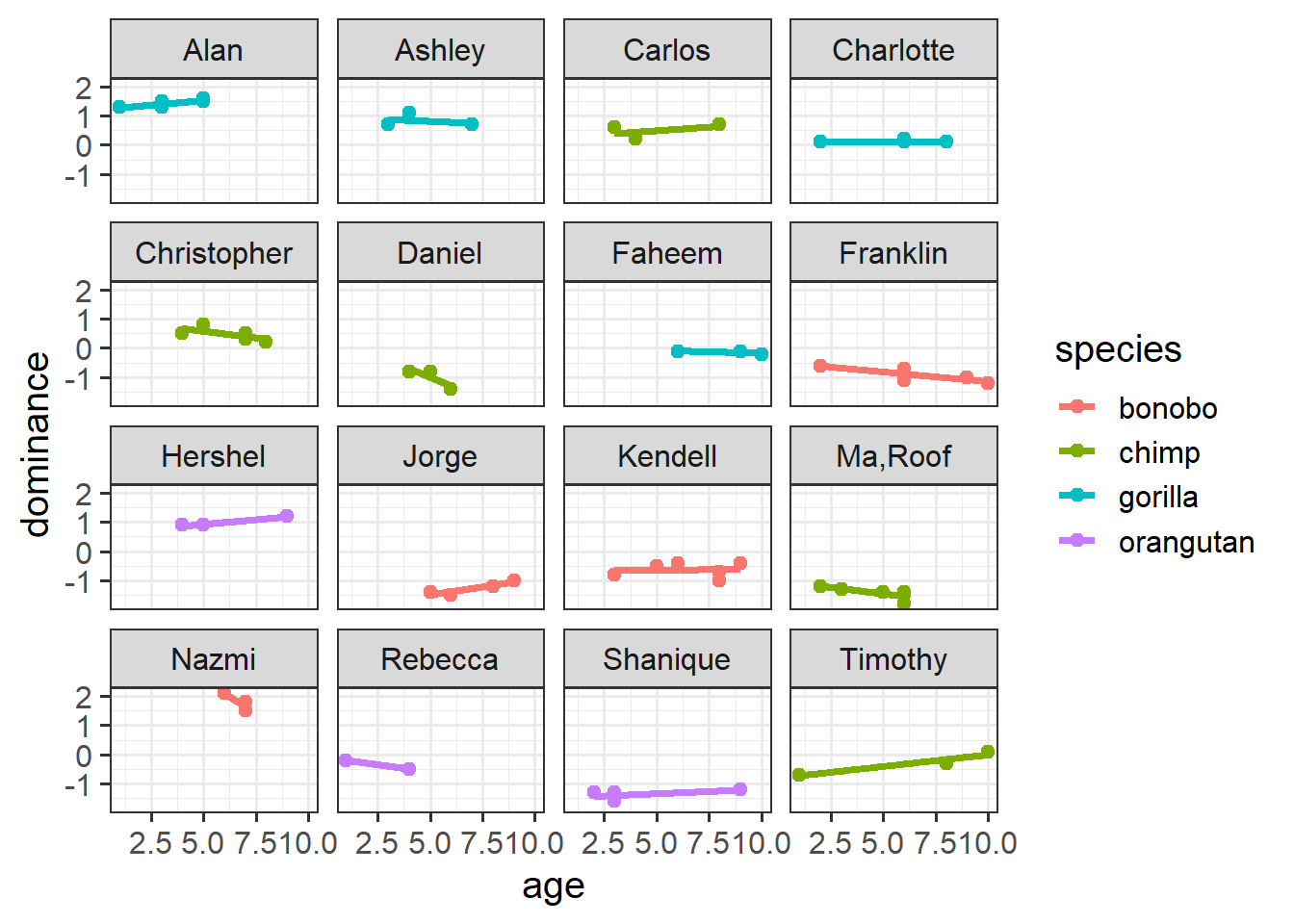 We have data from a large sample of great apes who have been studied between the ages of 1 to 10 years old (i.e. during adolescence). Our data includes 4 species of great apes: Chimpanzees, Bonobos, Gorillas and Orangutans. Each ape has been assessed on a primate dominance scale at various ages. Data collection was not very rigorous, so apes do not have consistent assessment schedules (i.e., one may have been assessed at ages 1, 3 and 6, whereas another at ages 2 and 8).