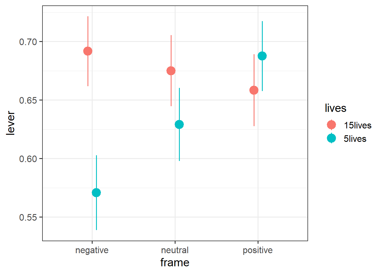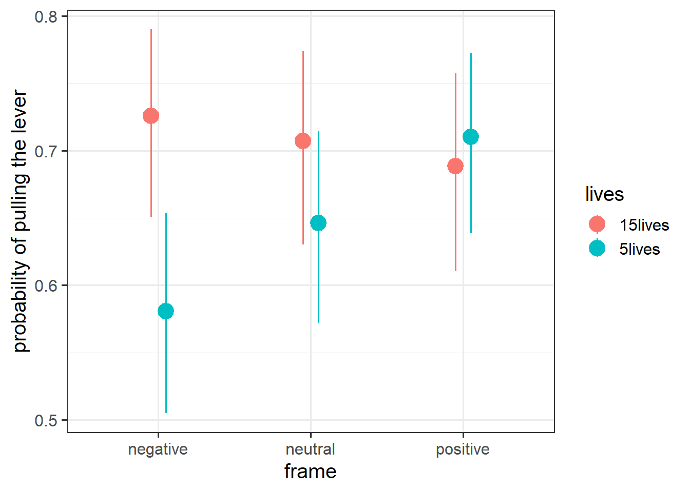 120 participants were recruited, and each gave answers to 12 versions of the thought experiment. For each participant, four versions followed each of the positive/neutral/negative framings described above, and for each framing, 2 would save 5 people and 2 would save 15 people.