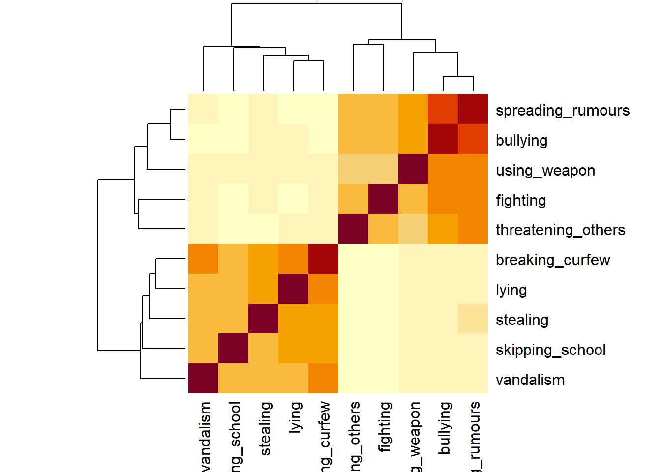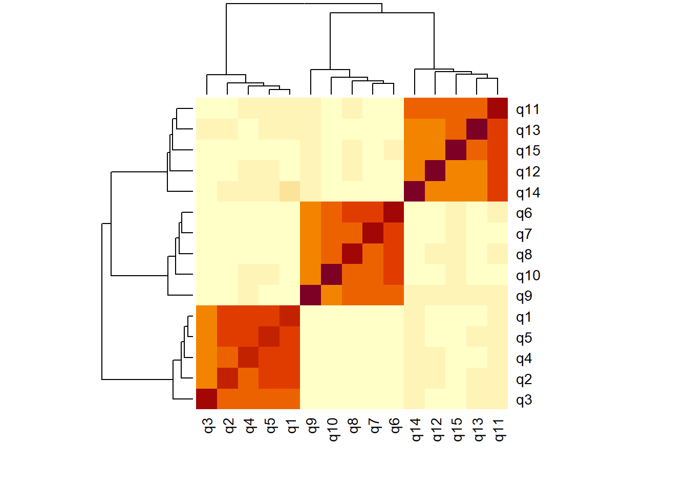 It looks like we’ve got some very strong groups of questions there - q1 to q5 are all highly related to one another, as are q6 to q10, and q11 to q15. Furthermore, the relations between those sets are very weak, suggesting 3 groups that are fairly distinct.