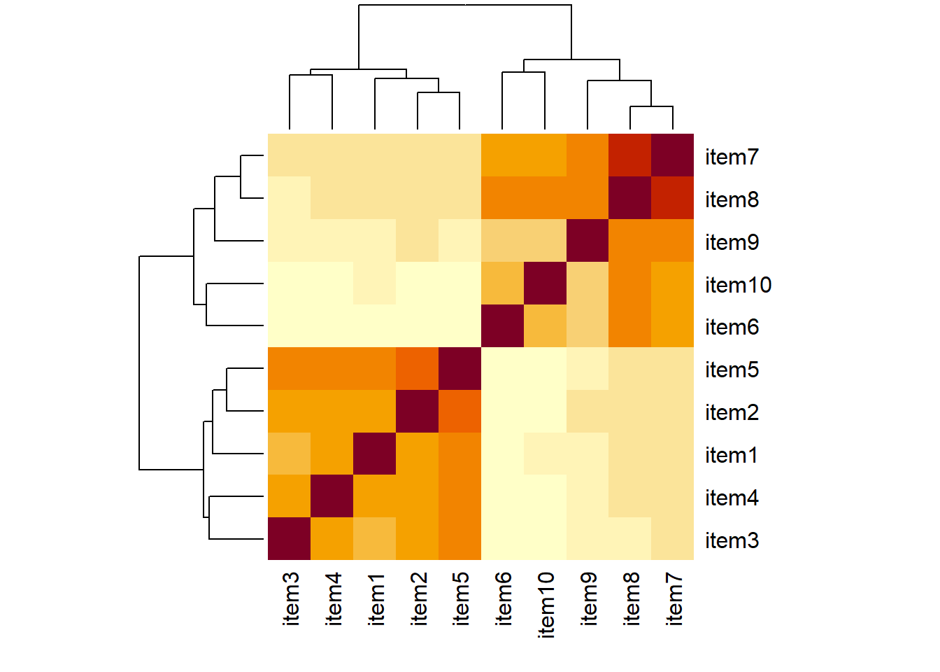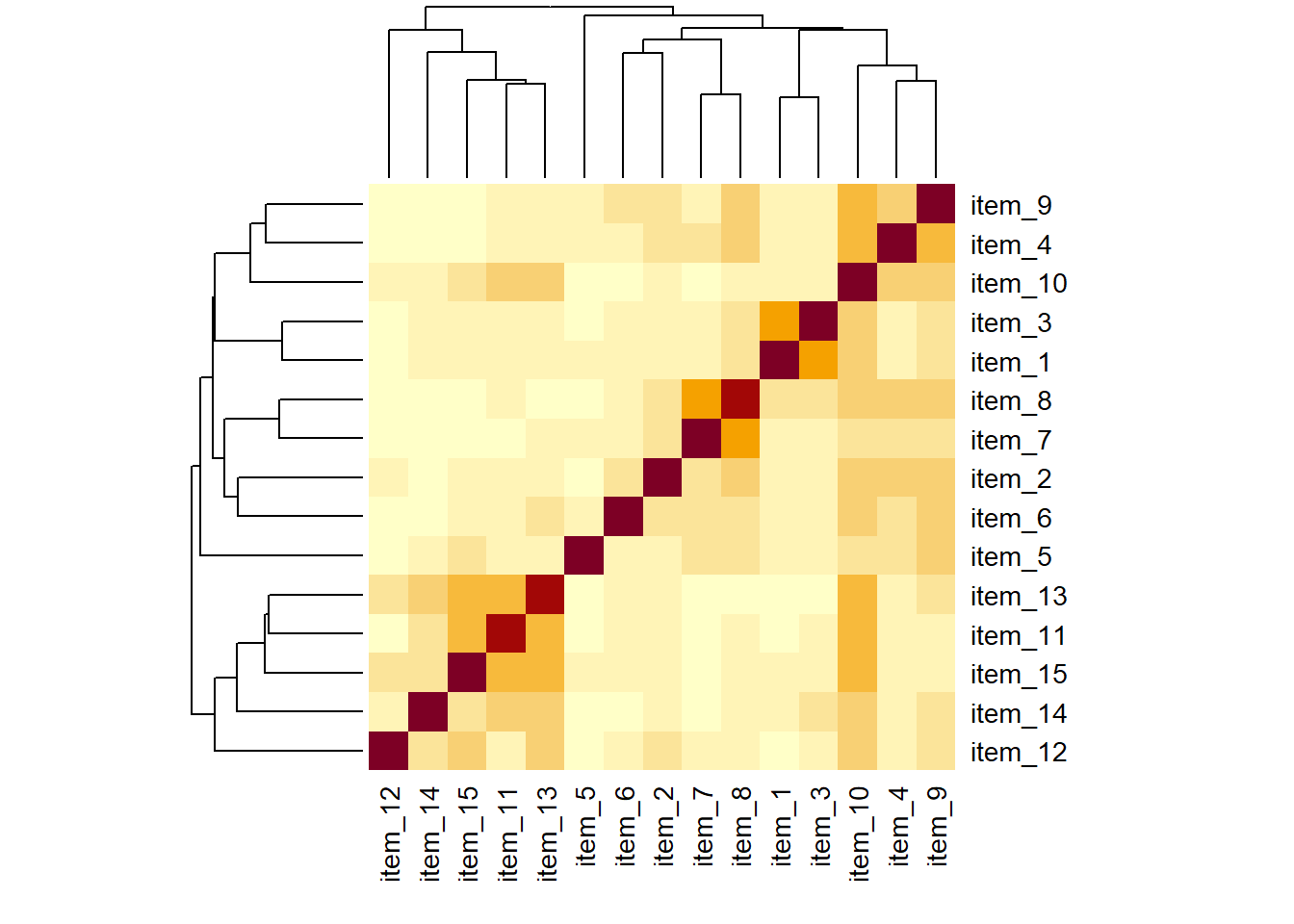 Solution 14. From the visual of the correlation matrix, you can see the vague outline of two groups of items correlations. Note there’s a little overlap..