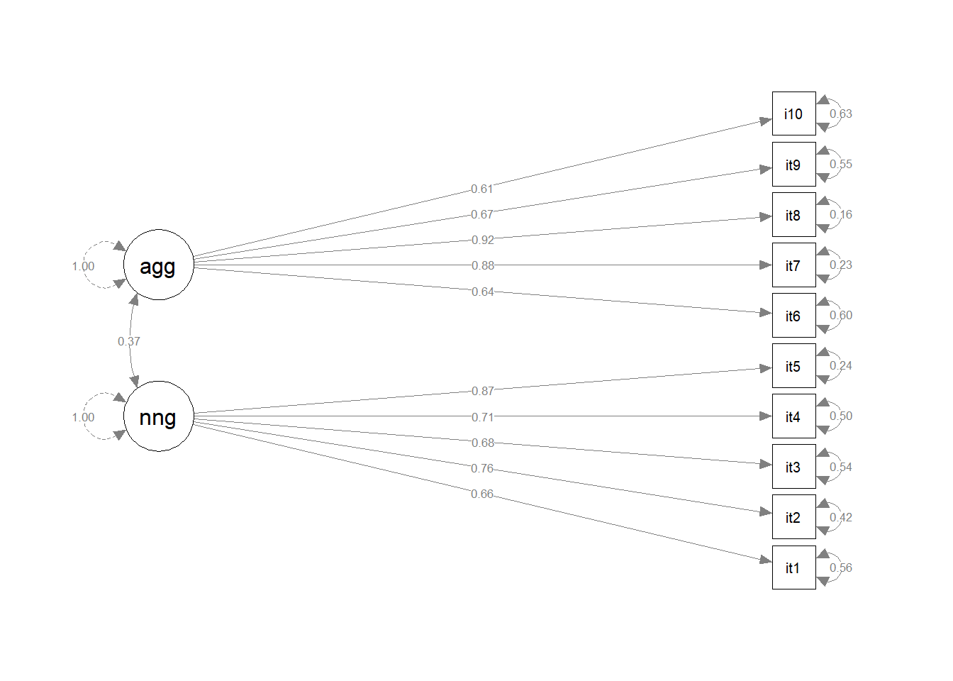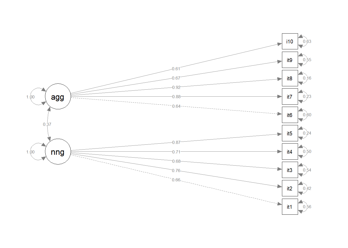 It maybe makes sense that there is some residual covariance between item6 (“threatening others”) and item10 (“fighting”), but it’s only a weak correlation (0.14). Not worth adding.