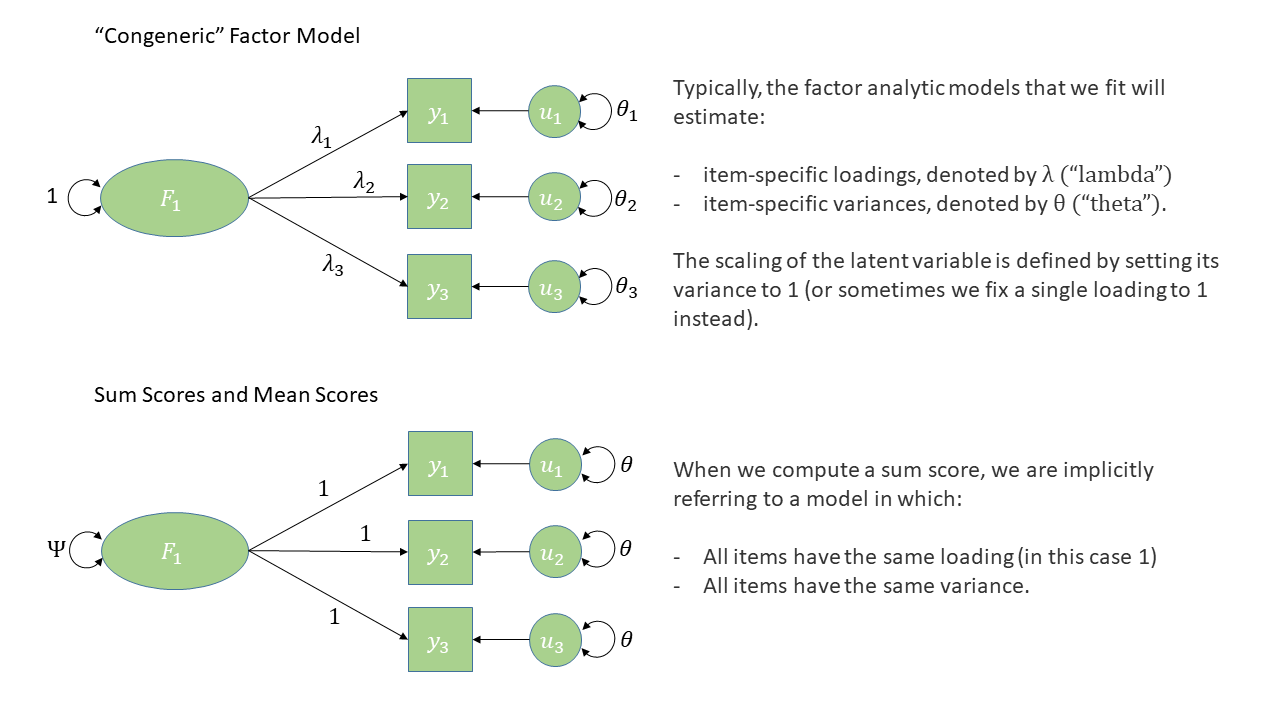 Solution 13. Computing sum scores can feel like a ‘model free’ calculation, but actually it does pre-suppose a factor structure, and a much more constrained one than those we have been estimating. Specifically, we’re assuming that all items contribute equally to an underlying factor, rather than being weighted differently, and that all items also have the same variance as one another.