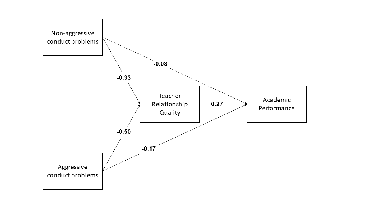 Make a sketch for a model in which both aggressive and non-aggressive conduct problems have indirect (via teacher relationships) and direct effects on academic performance.