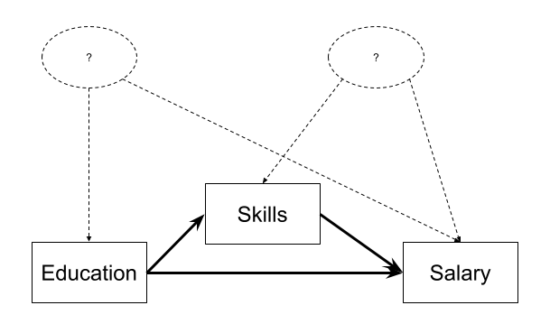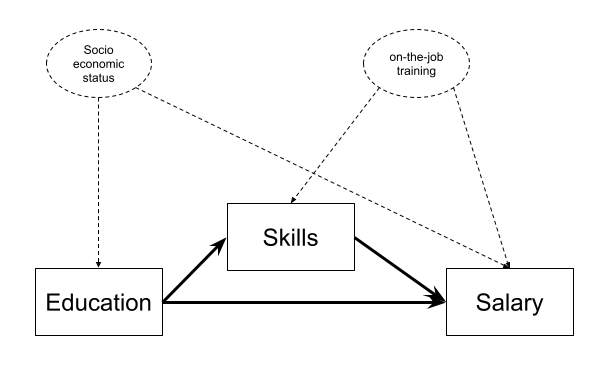 Instead, let’s suppose we are actually interested in the mechanism of how education influences salary. Do more educated people tend to have higher salaries in part because of the skills obtained during their education?