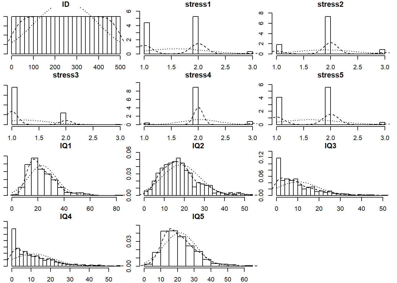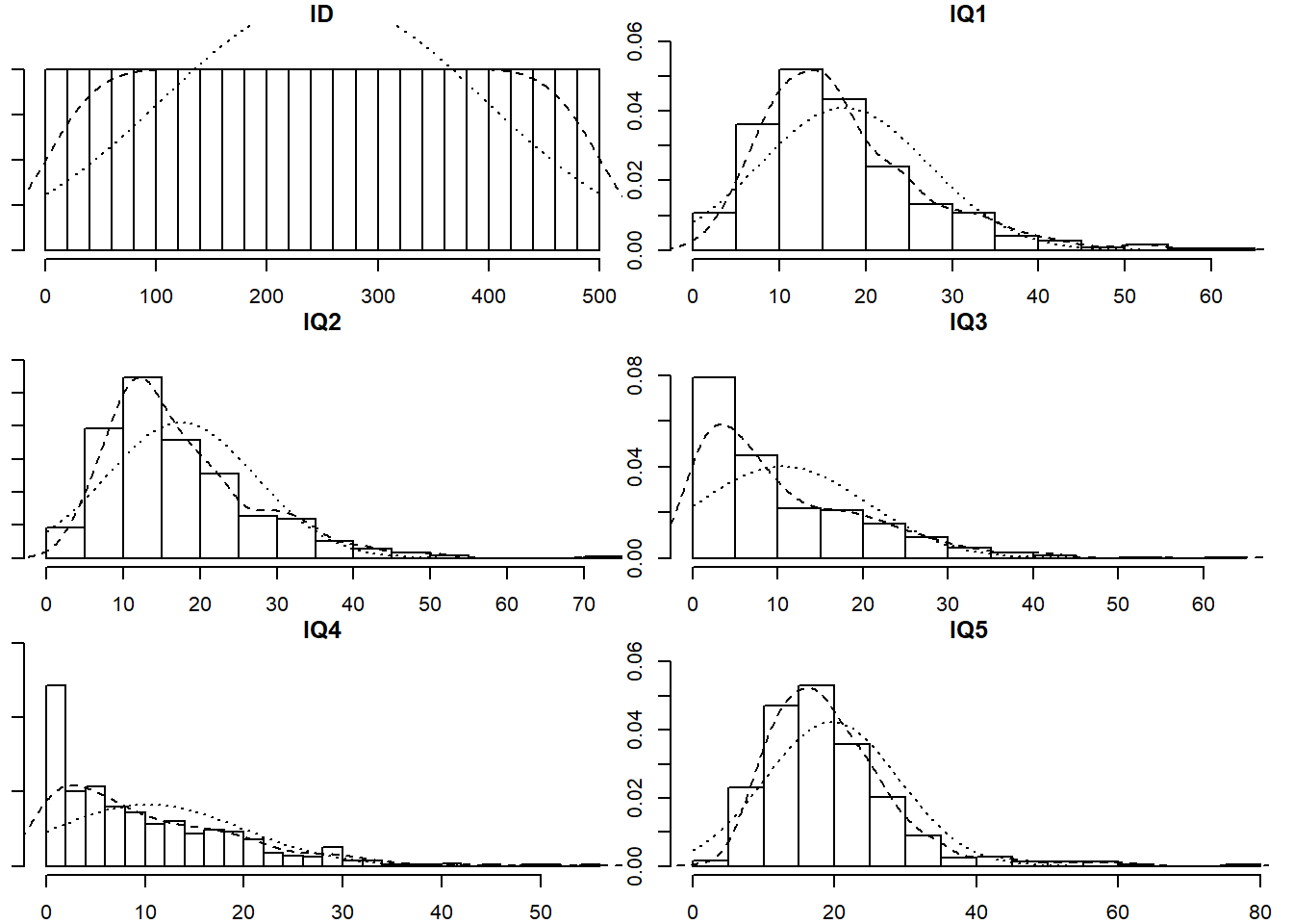 Read in the data and explore it. Look at the individual distributions of each variable to get a sense of univariate normality, as well as the number of response options each item has.