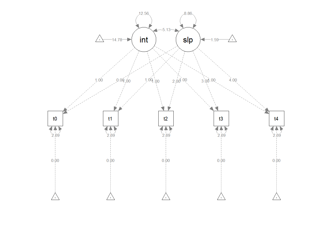 What we are then interested in estimating is the variances and the means of the two latent variables (Intercepts and Slopes). In previous models we’ve been mostly concerned with modelling covariance (i.e., how variables change with one another), but we can also include the estimation of means (the average of each variable). In a diagram, these sometimes get drawn as the paths from a triangles with a 1 in it (this is just like an intercept in regression \(y = b_1\cdot1 + b2\cdot x\) - it is the \(b_1\) we are estimating, and the 1 in the triangle is just to indicate that it is a constant).