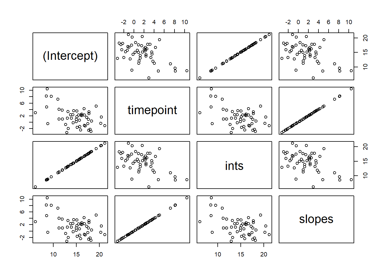 The model that we just fitted contains “random intercepts” and “random slopes”. We’ve talked about these as the group-level variability around the fixed intercept and fixed slope.