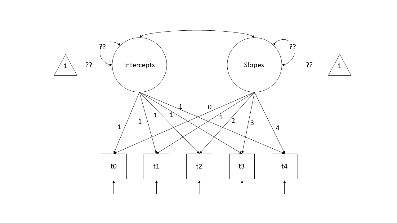 In this setup, we can start to think of each column containing scores as an indicator of a child’s underlying latent level of PSB (i.e., a child who scores high on all those observed variables (t0 to t4) is high on the unobserved latent construct of ‘pro-social behaviour’ and one who scores lower is estimated to be lower). With a little bit of trickery, we can encode the time-ordered structure of these indicators and split this up into an latent ‘intercept’ and a latent ‘slope’. To do so, we specify a model like the diagram below.