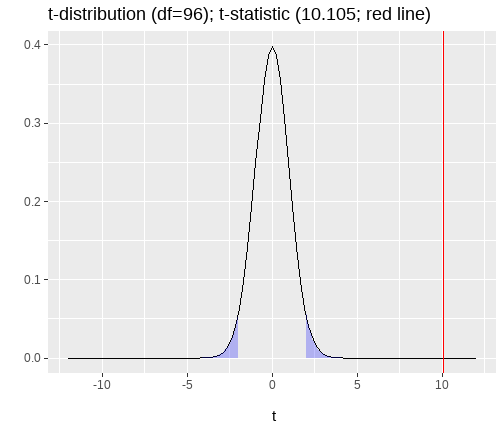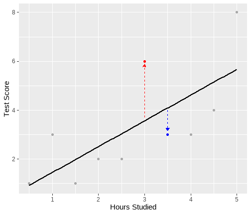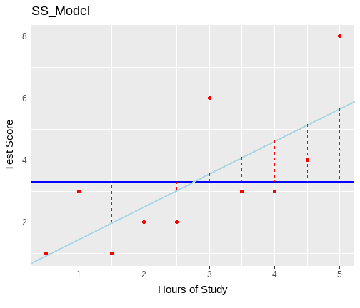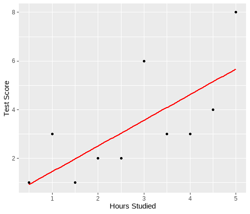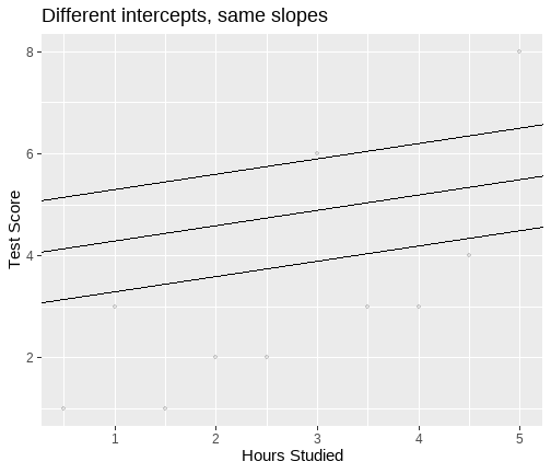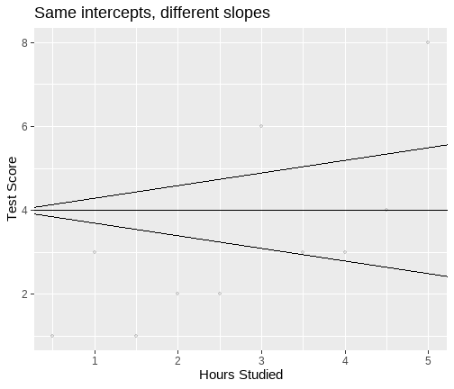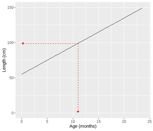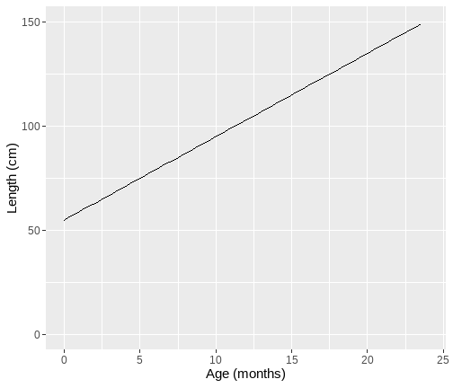 The University of Edinburgh ] .date[ ### April 2024 ] --- # Overview - Day 1: What is a linear model? - Day 2: But I have more variables, what now? - Day 3: Interactions - Day 4: Is my model any good? --- class: center, middle # Day 1 **What is a linear model?** --- class: inverse, center, middle <h2>Part 1: What is the linear model?</h2> <h2 style="text-align: left;opacity:0.3;">Part 2: Best line </h2> <h2 style="text-align: left;opacity:0.3;">Part 3: Single continuous predictor = correlation</h2> <h2 style="text-align: left;opacity:0.3;">Part 4: Single binary predictor = t-test</h2> --- # What is a model? + Pretty much all statistics is about models. + A model is an idea about the way the world is. + A formal representation of a system or relationships + Typically we represent models as functions. + We input data + Specify a set of relationships + We output a prediction --- # An Example + To think through these relations, we can use a simple example. + Suppose I have a model for growth of babies.<sup>1</sup> $$ Length = 55 + 4 * Month $$ .footnote[ [1] Length is measured in cm. ] --- # Visualizing a model .pull-left[ <!-- --> ] .pull-right[ {{content}} ] -- + The black line represents our model {{content}} -- + The x-axis shows `Age` `\((x)\)` {{content}} -- + The y-axis values for `Length` our model predicts {{content}} --- # Models as "a state of the world" + Let's suppose my model is true. + That is, it is a perfect representation of how babies grow. + My models creates predictions. + **IF** my model is a true representation of the world, **THEN** data from the world should closely match my predictions. --- # Predictions and data .pull-left[ <!-- --> ] .pull-right[ <table class="table table-striped" style="width: auto !important; margin-left: auto; margin-right: auto;"> <thead> <tr> <th style="text-align:right;"> Age </th> <th style="text-align:right;"> Prediction </th> </tr> </thead> <tbody> <tr> <td style="text-align:right;"> 10.00 </td> <td style="text-align:right;"> 95 </td> </tr> <tr> <td style="text-align:right;"> 10.25 </td> <td style="text-align:right;"> 96 </td> </tr> <tr> <td style="text-align:right;"> 10.50 </td> <td style="text-align:right;"> 97 </td> </tr> <tr> <td style="text-align:right;"> 10.75 </td> <td style="text-align:right;"> 98 </td> </tr> <tr> <td style="text-align:right;"> 11.00 </td> <td style="text-align:right;"> 99 </td> </tr> <tr> <td style="text-align:right;"> 11.25 </td> <td style="text-align:right;"> 100 </td> </tr> <tr> <td style="text-align:right;"> 11.50 </td> <td style="text-align:right;"> 101 </td> </tr> <tr> <td style="text-align:right;"> 11.75 </td> <td style="text-align:right;"> 102 </td> </tr> <tr> <td style="text-align:right;"> 12.00 </td> <td style="text-align:right;"> 103 </td> </tr> </tbody> </table> ] ??? + Our predictions are points which fall on our line (representing the model, as a function) + Here the arrows are showing how we can use the model to find a predicted value. + we find the value of the input on the x-axis (here 11), read up to the line, then across to the y-axis --- # Predictions and data .pull-left[ + Consider the predictions when the children get a lot older... {{content}} ] .pull-right[ <table class="table table-striped" style="width: auto !important; margin-left: auto; margin-right: auto;"> <thead> <tr> <th style="text-align:right;"> Age </th> <th style="text-align:right;"> Year </th> <th style="text-align:right;"> Prediction </th> <th style="text-align:right;"> Prediction_M </th> </tr> </thead> <tbody> <tr> <td style="text-align:right;"> 216 </td> <td style="text-align:right;"> 18 </td> <td style="text-align:right;"> 919 </td> <td style="text-align:right;"> 9.19 </td> </tr> <tr> <td style="text-align:right;"> 228 </td> <td style="text-align:right;"> 19 </td> <td style="text-align:right;"> 967 </td> <td style="text-align:right;"> 9.67 </td> </tr> <tr> <td style="text-align:right;"> 240 </td> <td style="text-align:right;"> 20 </td> <td style="text-align:right;"> 1015 </td> <td style="text-align:right;"> 10.15 </td> </tr> <tr> <td style="text-align:right;"> 252 </td> <td style="text-align:right;"> 21 </td> <td style="text-align:right;"> 1063 </td> <td style="text-align:right;"> 10.63 </td> </tr> <tr> <td style="text-align:right;"> 264 </td> <td style="text-align:right;"> 22 </td> <td style="text-align:right;"> 1111 </td> <td style="text-align:right;"> 11.11 </td> </tr> <tr> <td style="text-align:right;"> 276 </td> <td style="text-align:right;"> 23 </td> <td style="text-align:right;"> 1159 </td> <td style="text-align:right;"> 11.59 </td> </tr> <tr> <td style="text-align:right;"> 288 </td> <td style="text-align:right;"> 24 </td> <td style="text-align:right;"> 1207 </td> <td style="text-align:right;"> 12.07 </td> </tr> <tr> <td style="text-align:right;"> 300 </td> <td style="text-align:right;"> 25 </td> <td style="text-align:right;"> 1255 </td> <td style="text-align:right;"> 12.55 </td> </tr> </tbody> </table> ] -- + What do you think this would mean for our actual data? {{content}} -- + Will the data fall on the line? {{content}} --- # How good is my model? + How might we judge how good our model is? 1. Model is represented as a function 2. We see that as a line (or surface if we have more things to consider) 3. That yields predictions (or values we expect if our model is true) 4. We can collect data 5. If the predictions do not match the data (points deviate from our line), that says something about our model. --- # Linear model + The linear model is the workhorse of statistics. + When using a linear model, we are typically trying to explain variation in an **outcome** (Y, dependent, response) variable, using one or more **predictor** (x, independent, explanatory) variable(s). --- # Example .pull-left[ <table> <thead> <tr> <th style="text-align:left;"> student </th> <th style="text-align:right;"> hours </th> <th style="text-align:right;"> score </th> </tr> </thead> <tbody> <tr> <td style="text-align:left;"> ID1 </td> <td