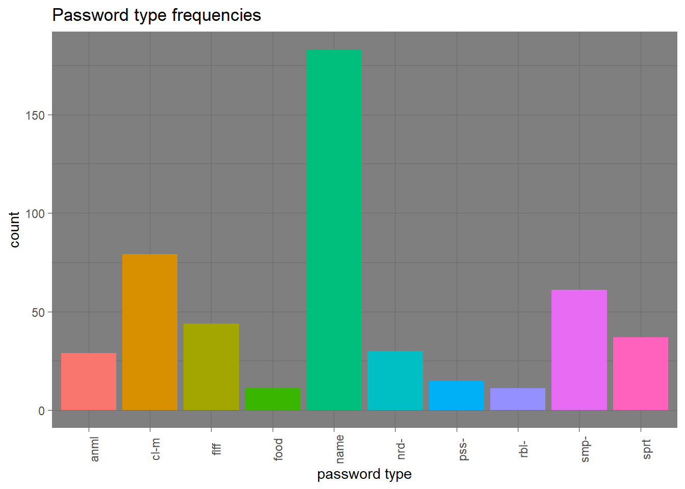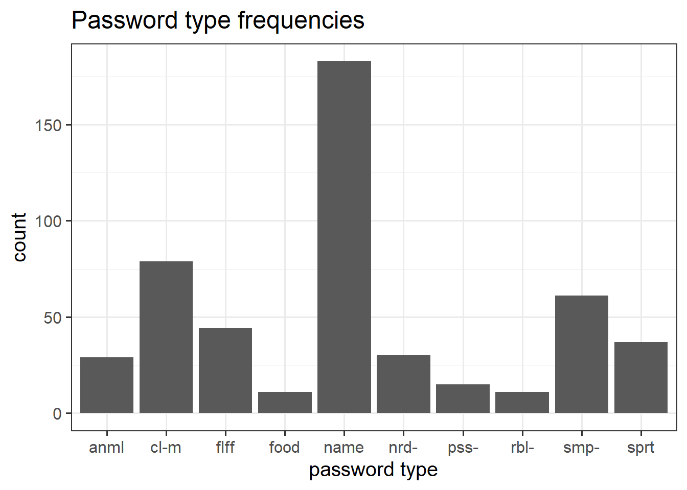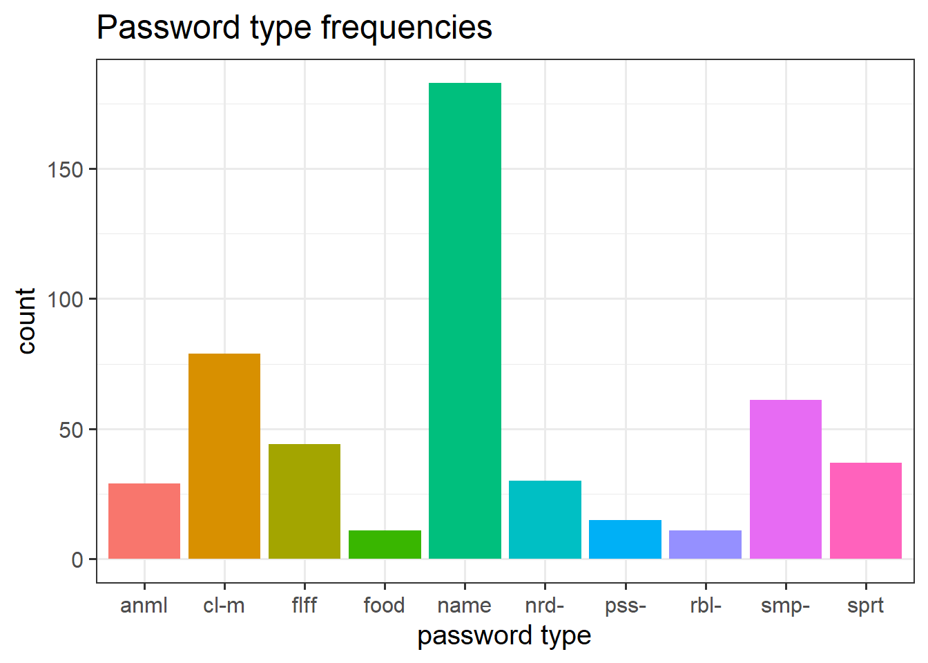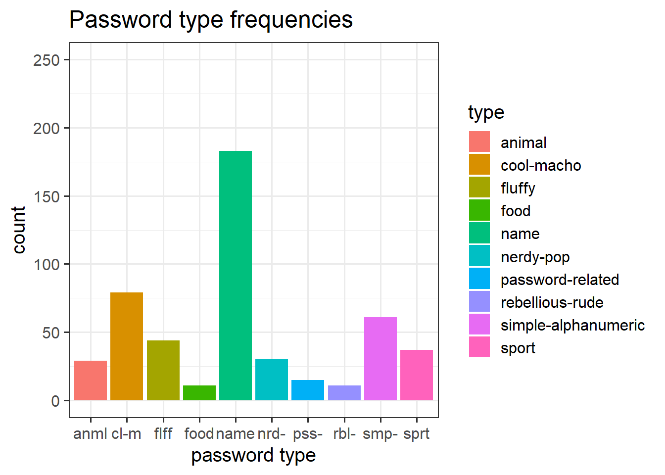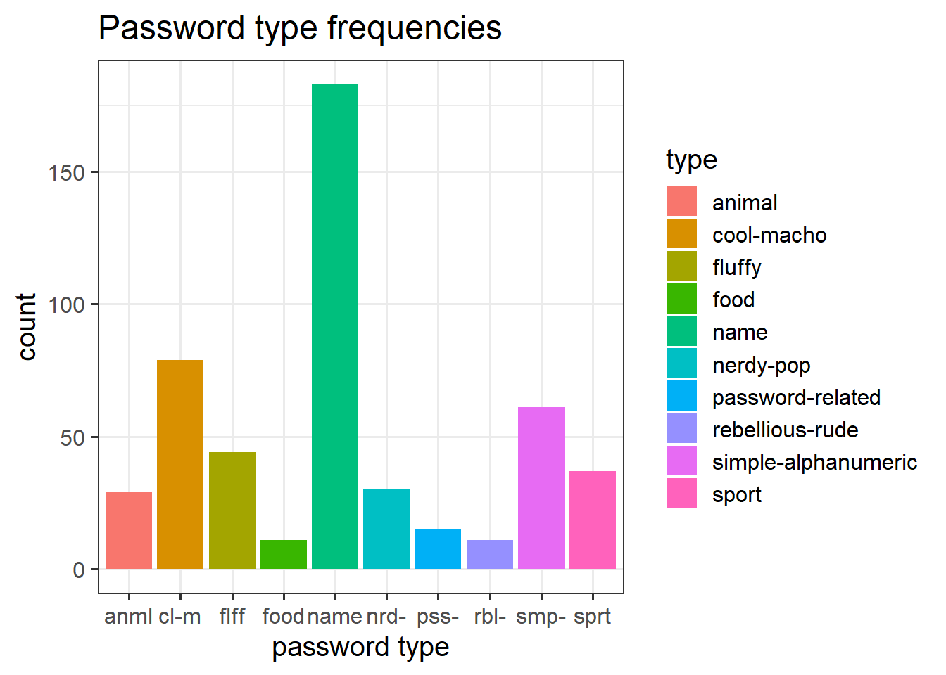 In our dataset on passwords, we have various categorical variables, such as the type of password (categories like “animal”, “fluffy” etc).
