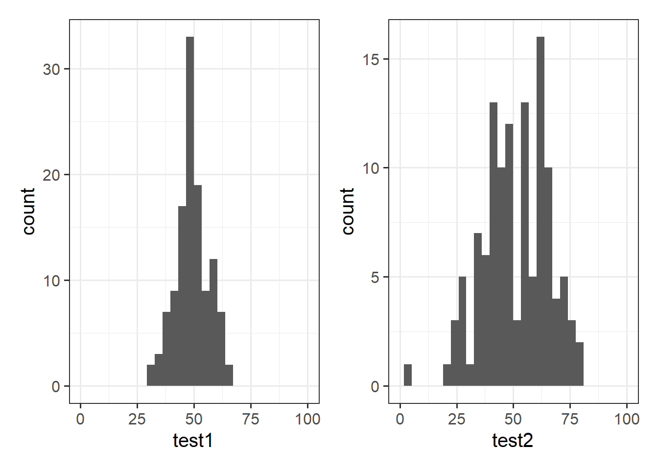 Tests 1 and 2 have similar means (around 50), but the standard deviation of Test 2 is almost double that of Test 1. We can see this distinction in the visualisation below - the histograms are centered at around the same point (50), but the one for Test 2 is a lot wider than that for Test 1.