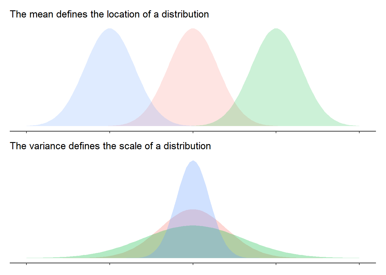 The “moments” of a distribution are the metrics that relate to the shape of that distribution. We’ve already seen the primary two moments that define the shapes of these distributions: the mean and the variance. The mean moves the distribution right or left, and the variance makes the distribution wider or narrower.