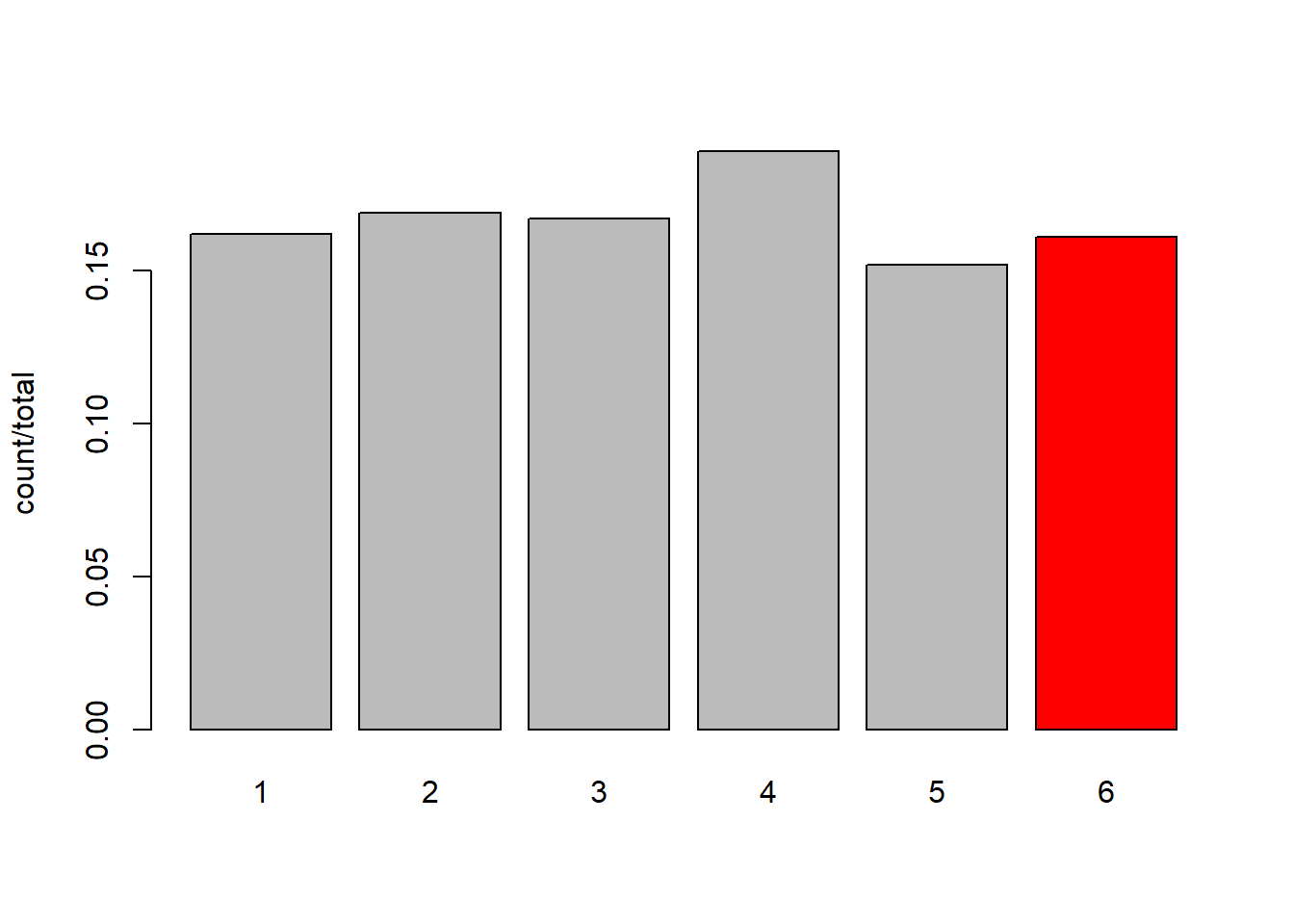 To think about questions like “what proportion of 1000 rolls does the die land on 6?”, we are simply interested in the count of 6s divided by the count of all rolls: