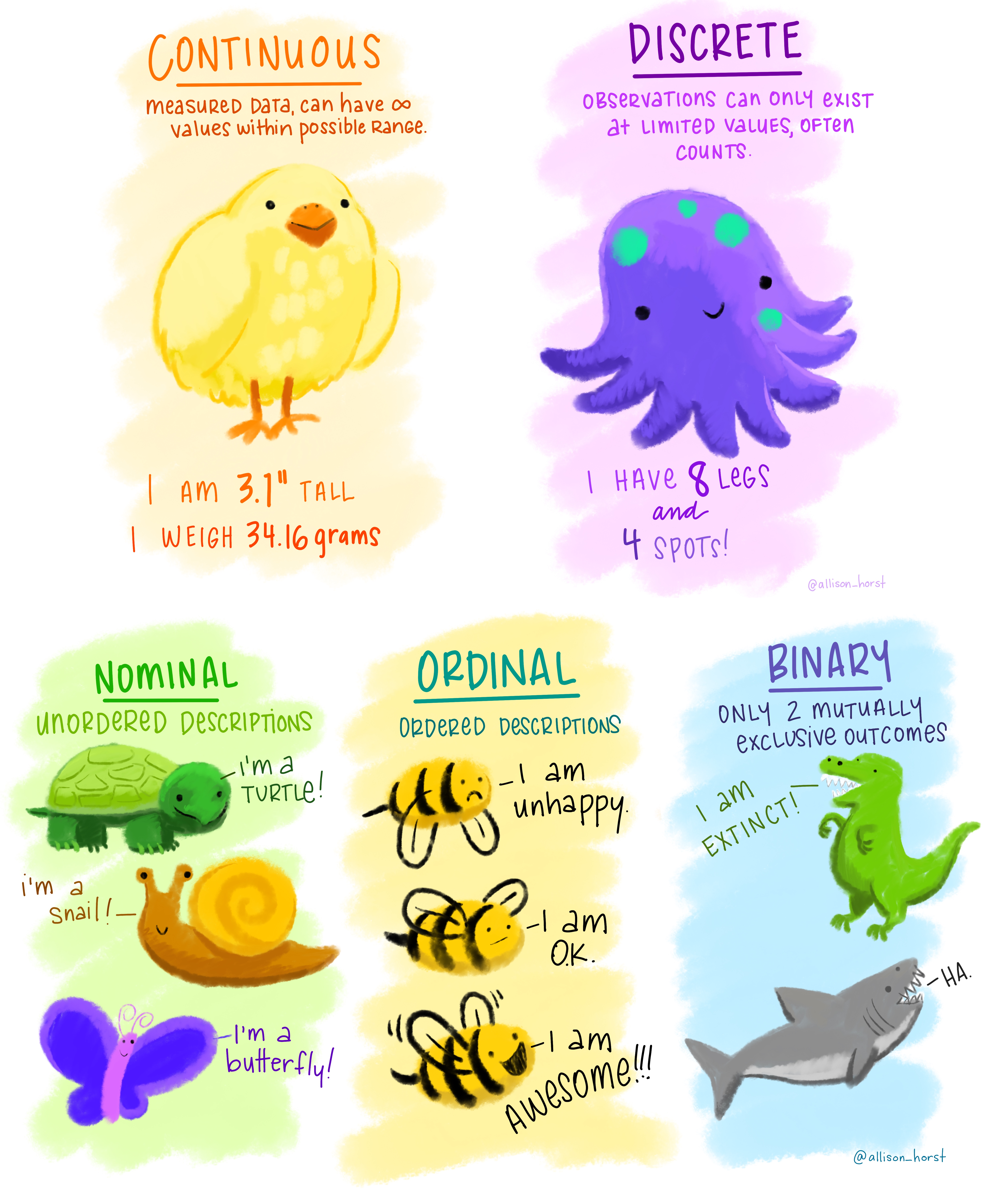 For example, think about the short survey we sent out at the start of this course. Amongst other things, the survey captures data on heights (it asks for answers in cm, and respondents can be precise as they like) and eye-colours (chosen from a set of options). We distinguish between these different types of data by talking about variables that are categorical (responses take one of a set of defined categories: “blue”, “green”, and so on..) and those that are numeric (responses are in the form of a number). Within each of these, there also are a few important sub-classes.