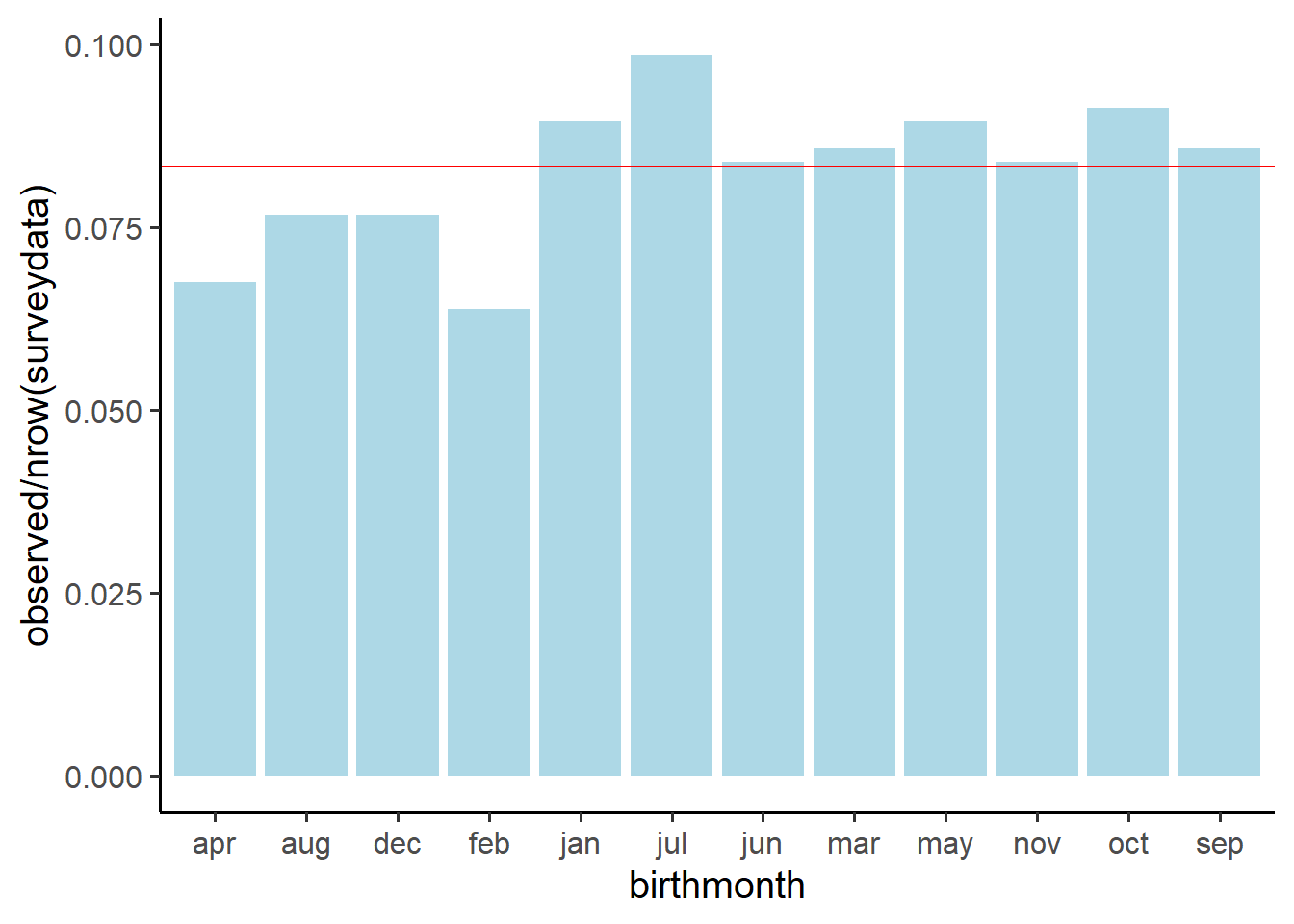 chisq.test(table(surveydata$birthmonth))(thetablefunction will ignore NAs by default, so we don’t need to do anything extra for this).