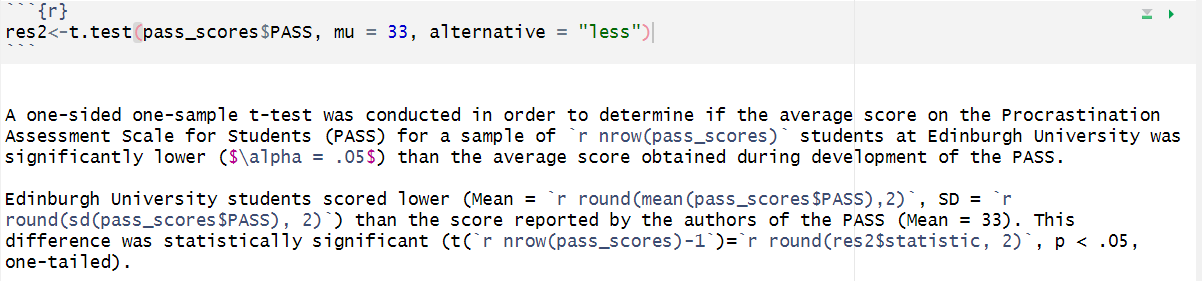 `r … … … `are used to execute small bits of R code, and include the output within the text. For instance, the line`r res2$statistic |> round(2)`gets the t-statistic from the results, and rounds it to 2 decimal places, which get’s printed out as -3.11. - the bits between the dollar signs, e.g. $\alpha$ will get printed as mathematical symbols such as \(\alpha\).
