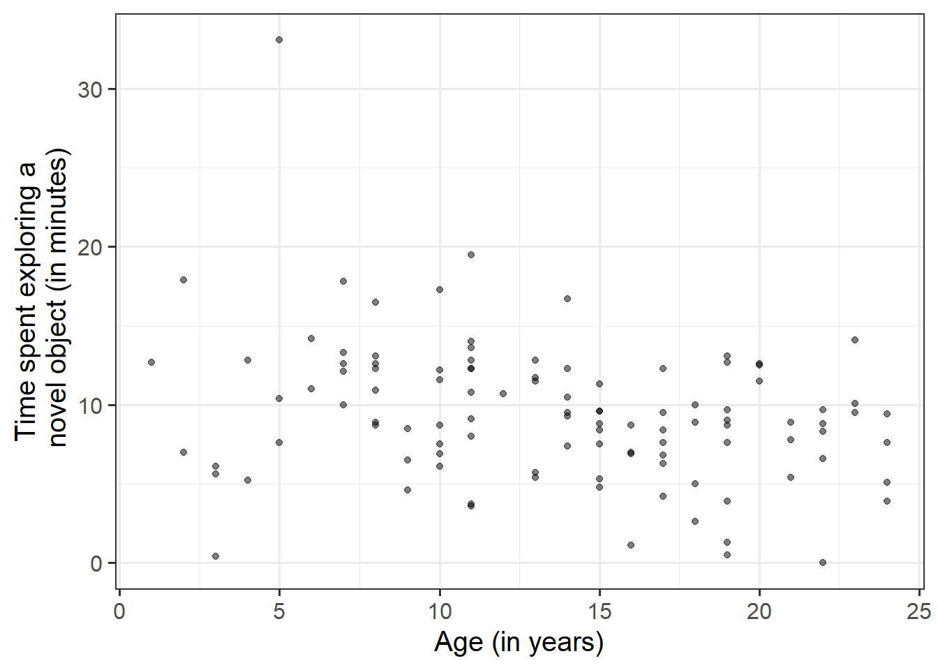 Liu, Hajnosz & Li (2023)1 have conducted a study on monkeys! They were interested in whether younger monkeys tend to be more inquisitive about new things than older monkeys do. They sampled 108 monkeys ranging from 1 to 24 years old. Each monkey was given a novel object, the researchers recorded the time (in minutes) that each monkey spent exploring the object.