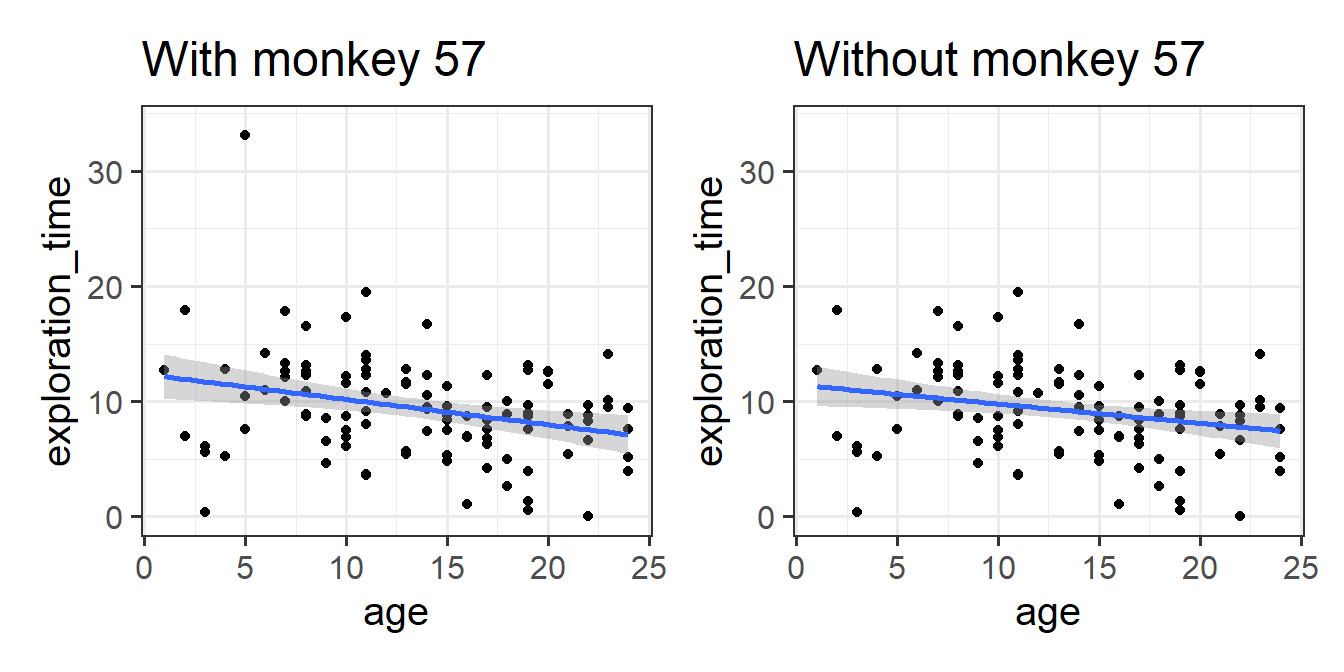 - As well as looking for patterns, these plots can also higlight individual datapoints that might be skewing the results. Can you figure out if there are any unusual monkeys in our dataset? Can you re-fit the model without that monkey? When you do so, do your conclusions change?