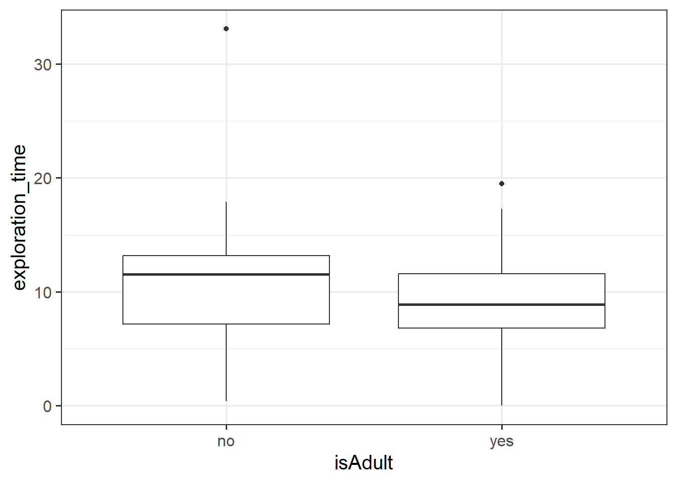 We’ve actually already seen a way to analyse questions of this sort (“is the average exploration-time different between juveniles and adults?”)