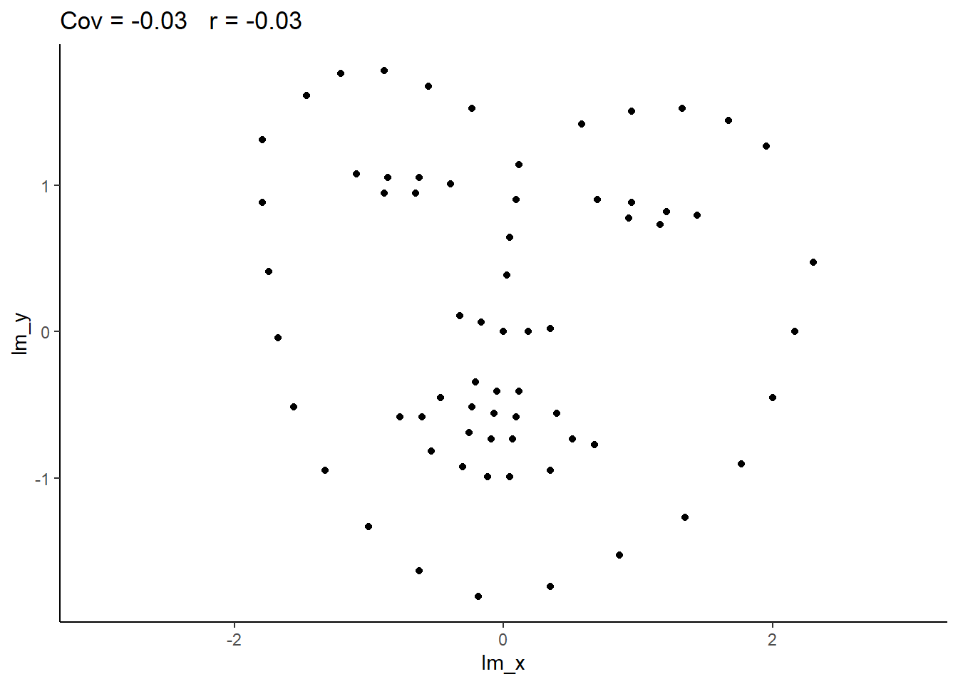 The correlation coefficient in Figure 1 below is negligible, suggesting no linear association. The word “linear” here is crucial - the data are very clearly related.