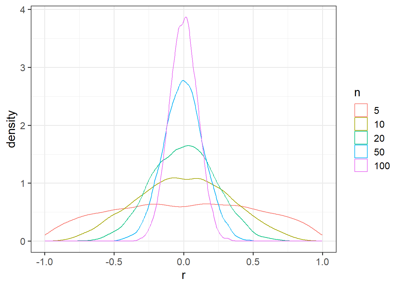 Remember that in hypothesis testing, we need a distribution against which to compare a statistic. But \(r\) is bounded (it can only be between -1 and 1). This means the distributions of “\(r\)’s that we would expect if under repeated sampling” is not easily defined in a standard way. Consider how the shape changes when our sample size changes: